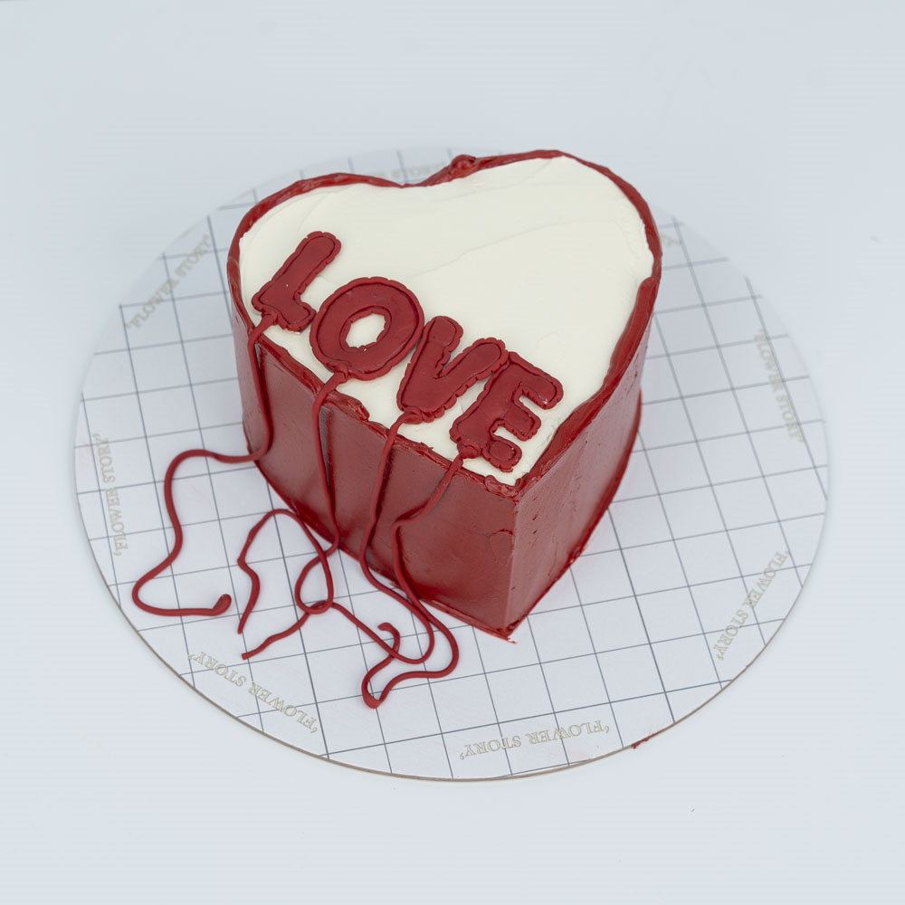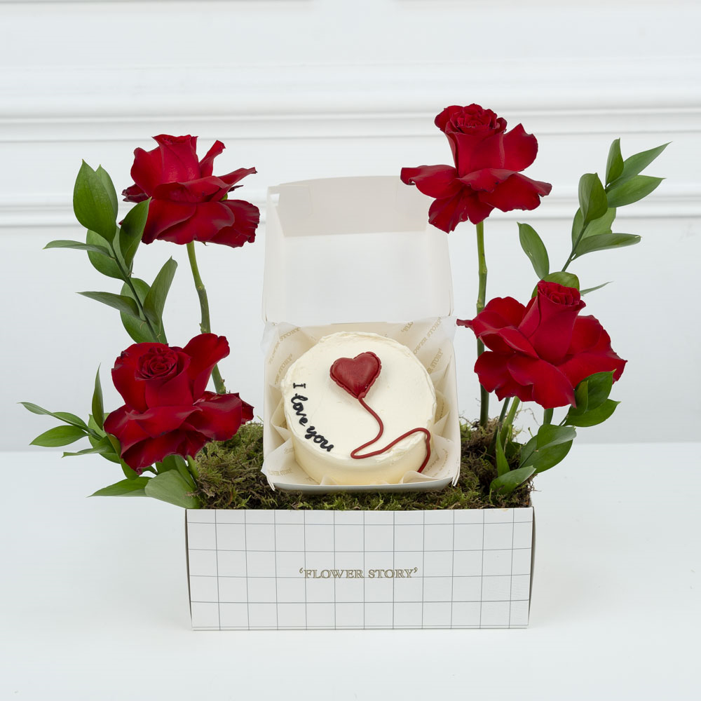 A chocolate bento cake with a hand bouquet.