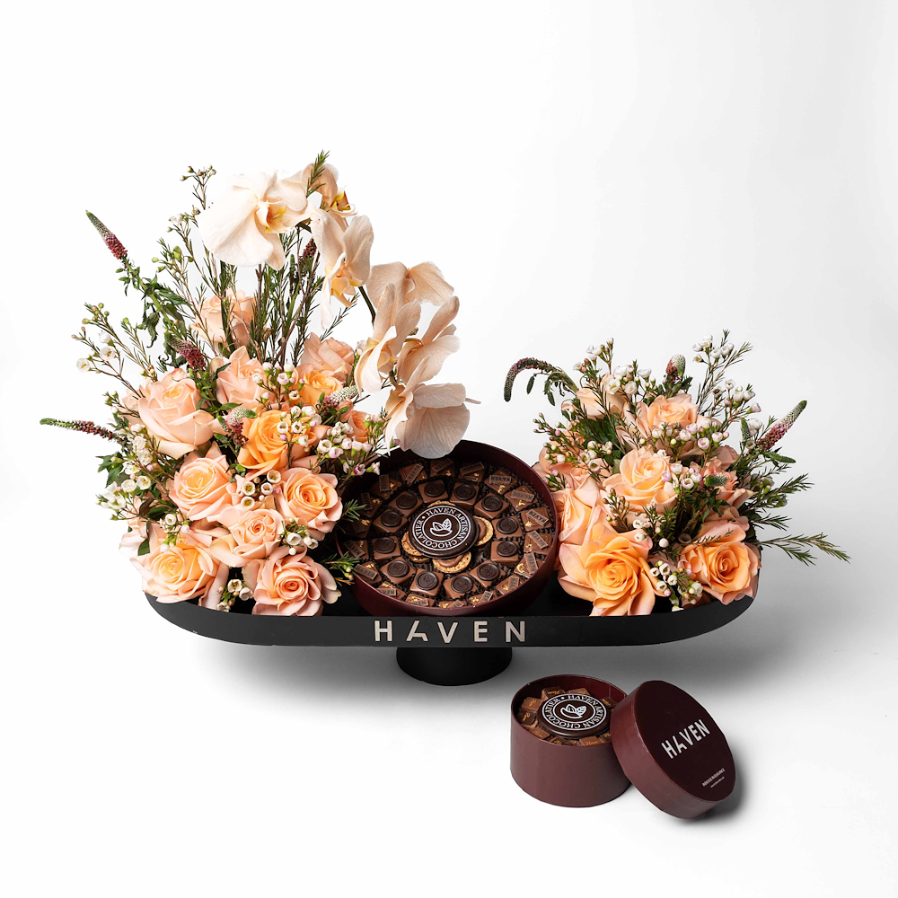 An elegant tray filled with mixed chocolates, decorated with flowers.