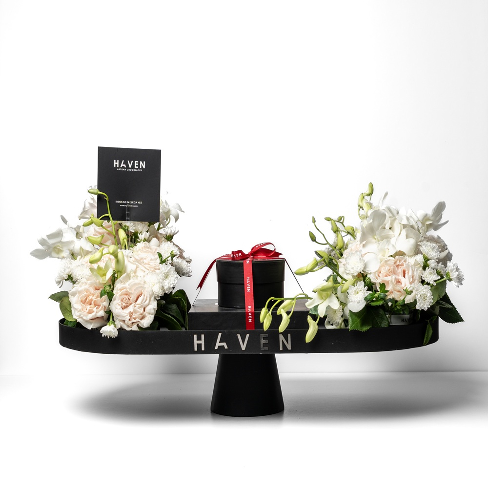 An elegant tray filled with mixed chocolates and almond crackers, decorated with flowers.