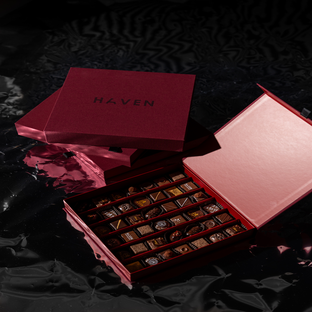 An assortment of fine chocolates, elegantly presented in a stylish box.