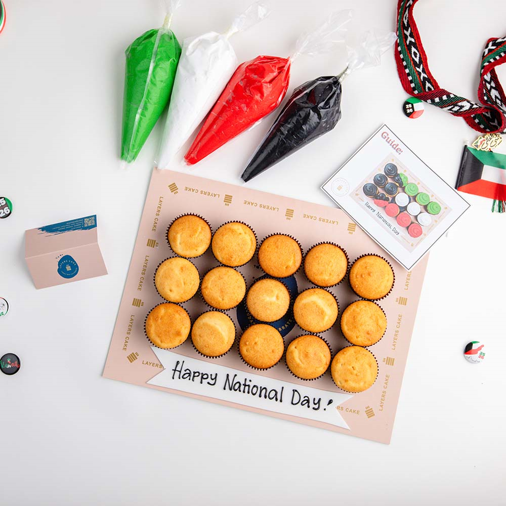 15 pieces of vanilla cupcakes, with 4 bags of cream included for decorating and drawing the Kuwaiti flag.