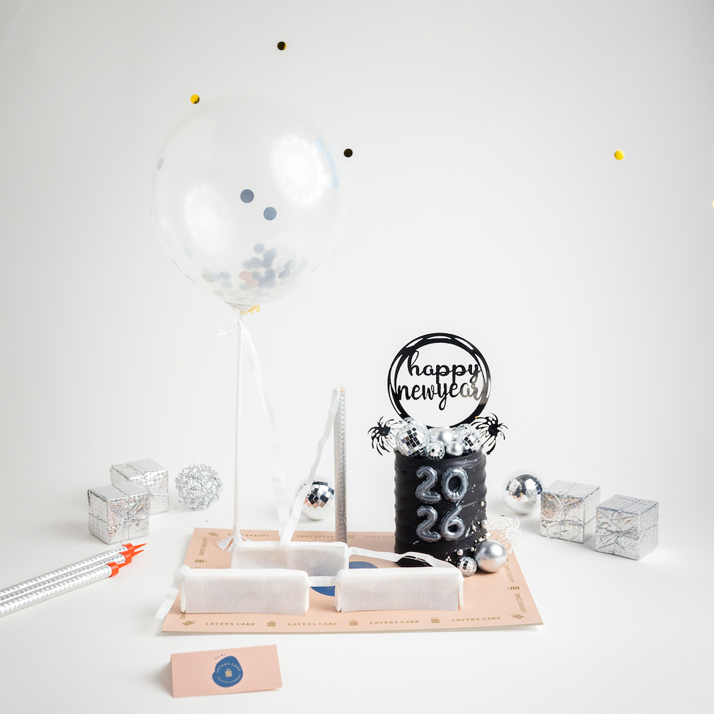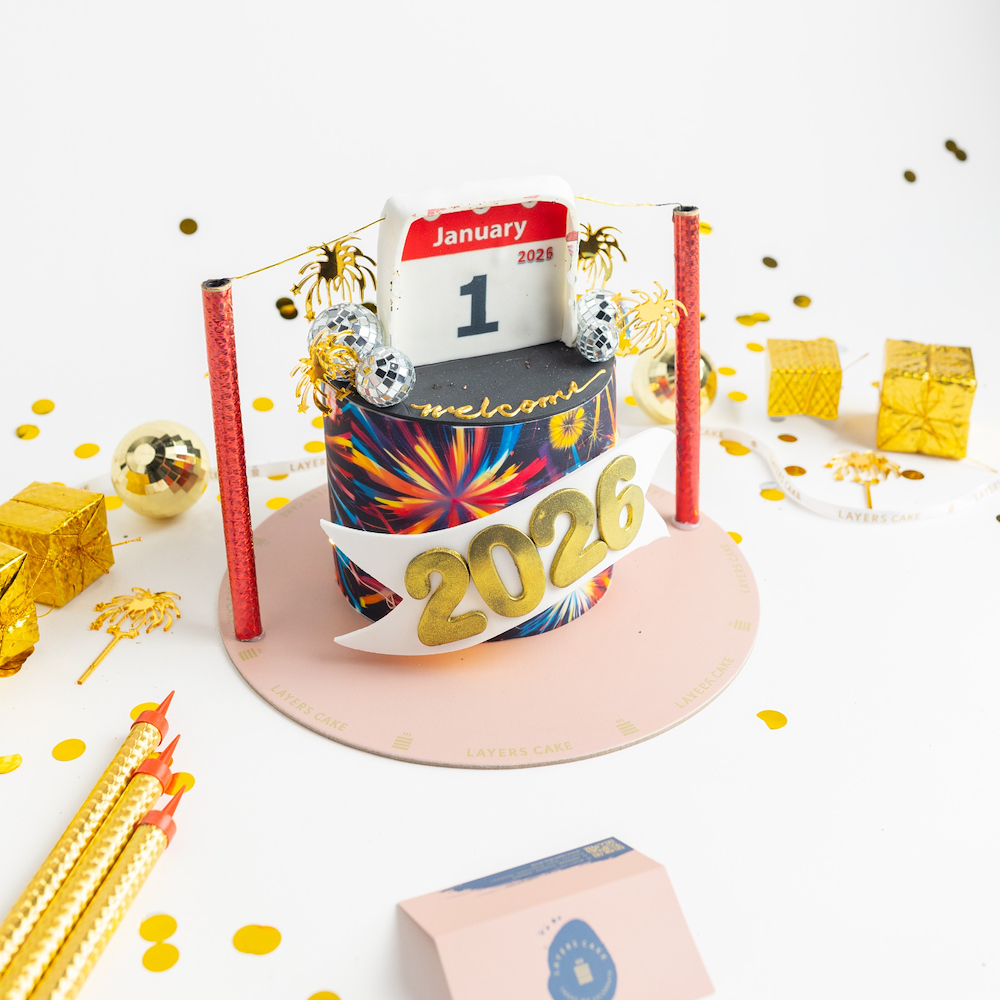 A delicious 6 inch cake serving 6 to 8 persons, featuring four layers with three mixed flavors by layers, chocolate, red velvet, and vanilla, finished with rich cream cheese frosting, and including paper and a pen to write wishes and place them on the cake, along with celebration fire paper and a fireworks candle.