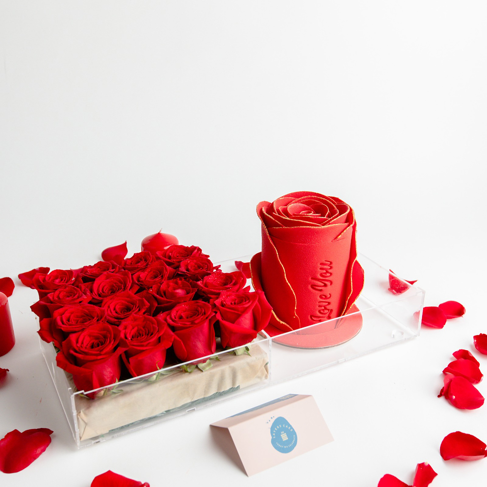 A tray that contains a rose shaped cake along with roses.