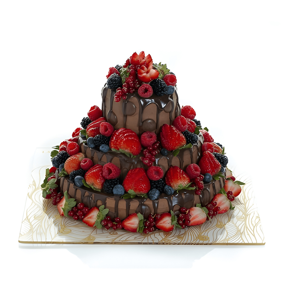 A cake made of chocolate sponge, creme burlee, almond slices & dark chocolate ganache, decorated with fresh fruits.