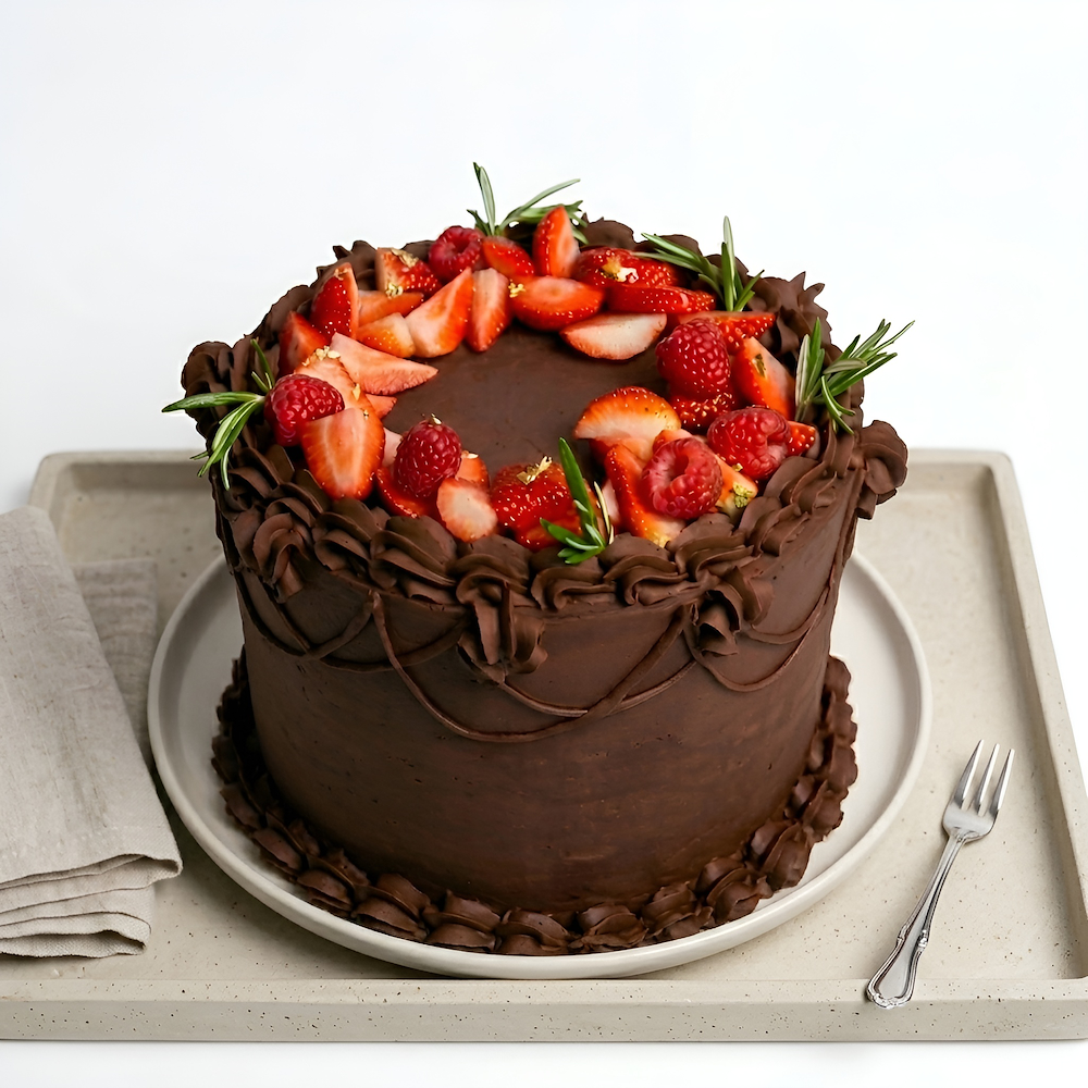 A cake featuring chocolate with raspberries and strawberries, serving 10–12 persons.