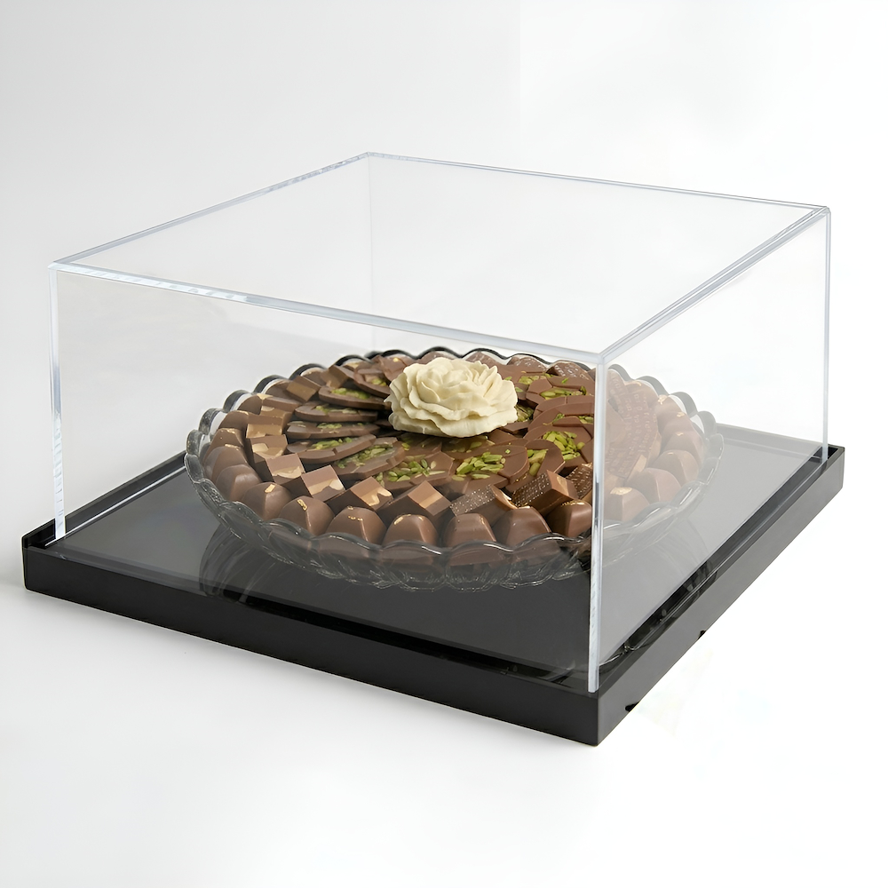 A crystal tray containing 1 kg of chocolates in different flavors: digestive peanut butter, hazelnut and praline, Gianduja, and energy pistachio, arranged in an acrylic box.