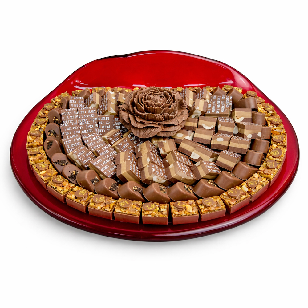 A tray containing 1.834 kg of Vintage, Zaatar Bites, and Gianduja, with dimensions of 31 cm length, 30 cm width, and 13 cm height.