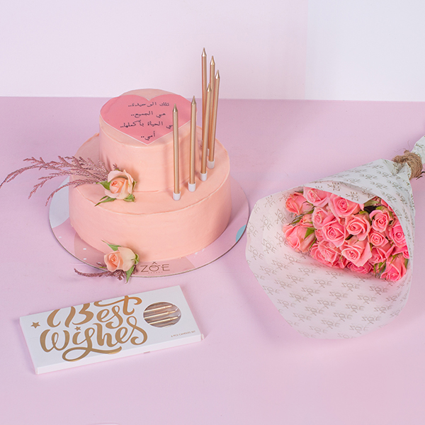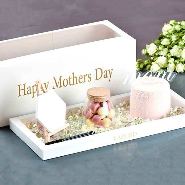 A beautiful box illuminated by small lights that contains natural flowers, a small cake enough for 3 persons, a jar filled with chocolate and a small board for you to write a special message to the most special person in your life, your mom.The cake comes in multiple flavors chocolate, vanilla or red velvet (please mention the desired flavor in the product note).