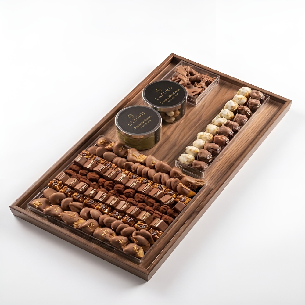 A tray containing 1.8 kg of pecan chocolate, caramelized cashew nuts, dragee coconut, dried fruits, and dates.