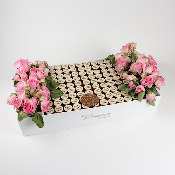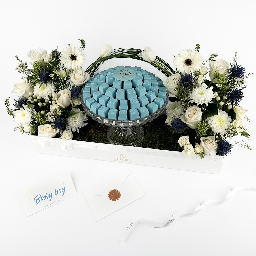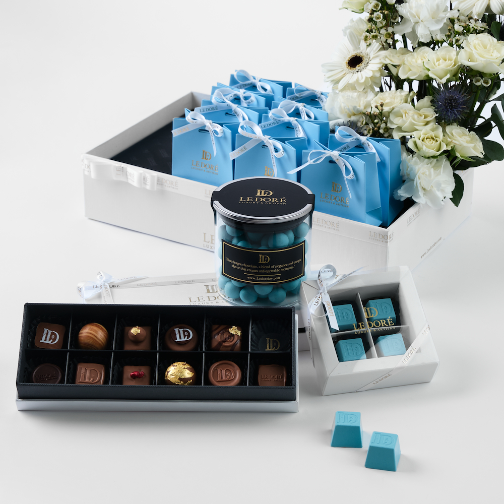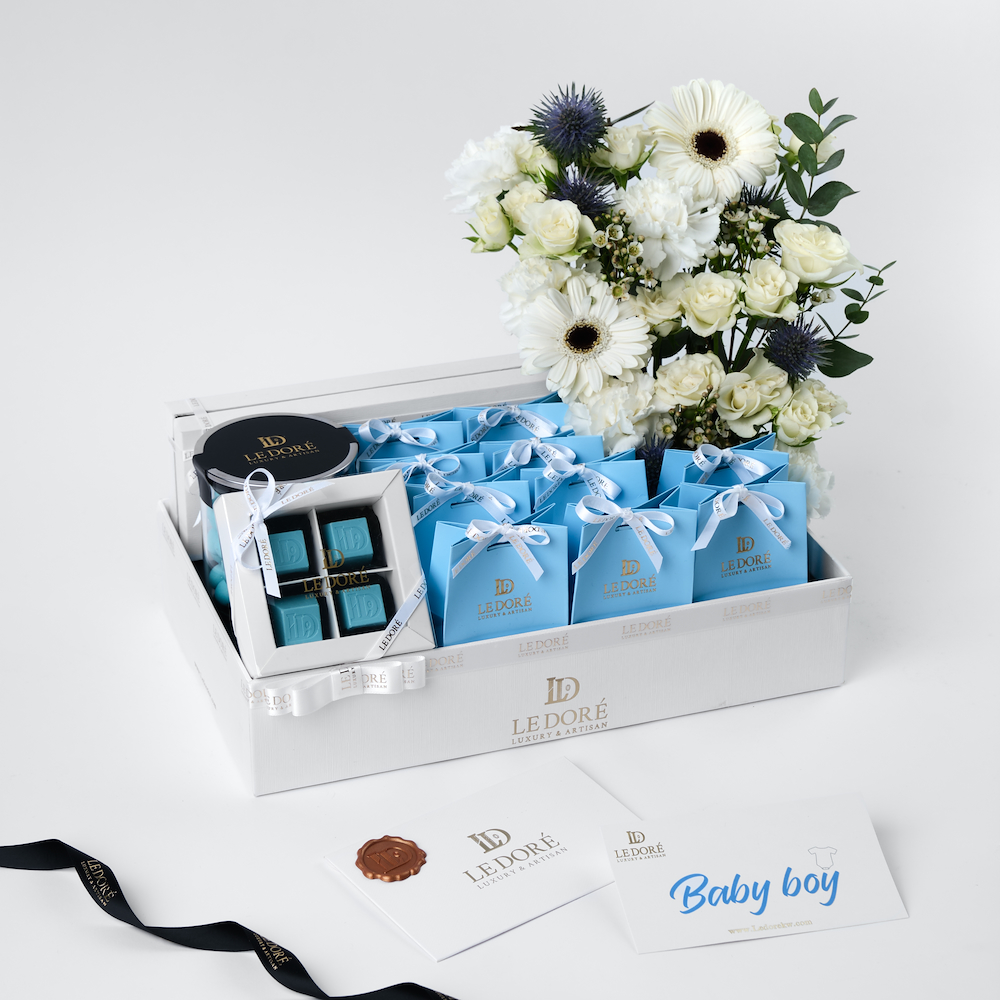 This luxury box contains 10 special giveaways and a small box with 4 pieces of chocolate and a box with 12 pieces of chocolate, a jar of blue hazelnut, and flowers.