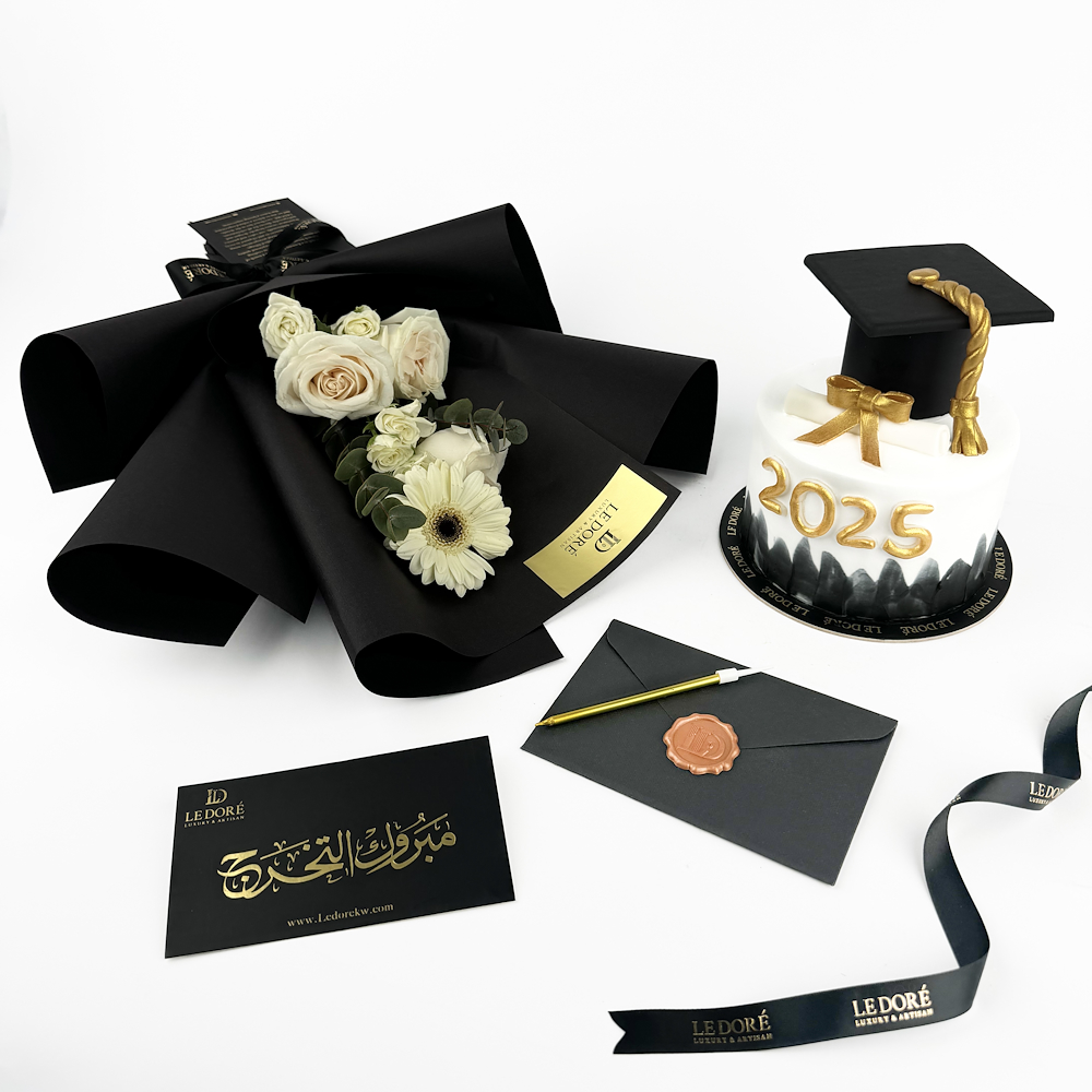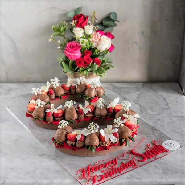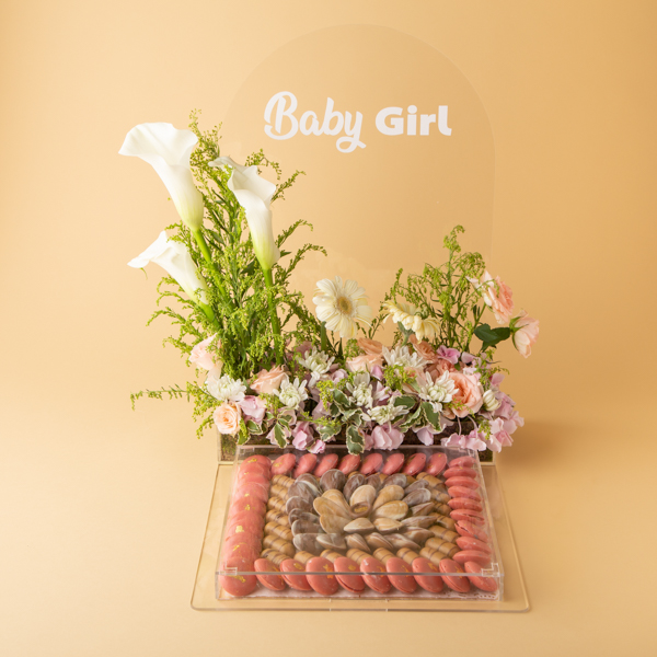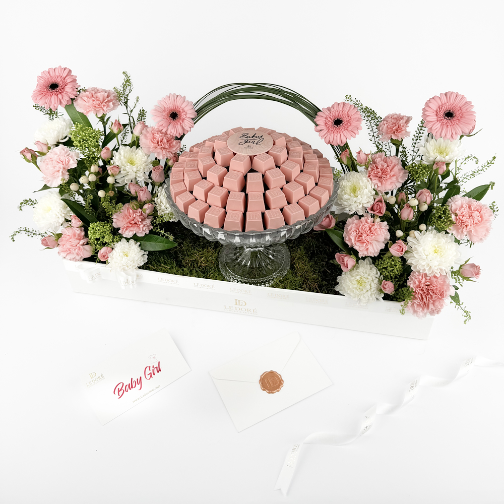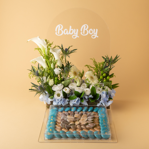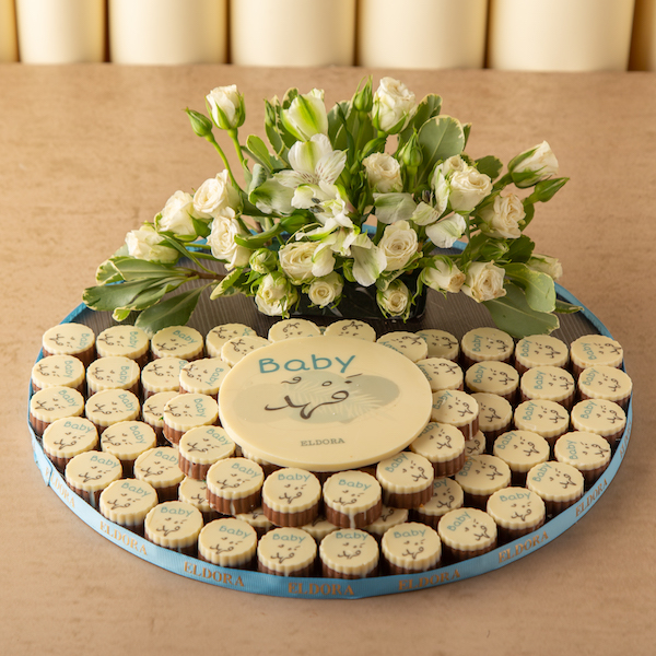 This luxury box contains 10 special giveaways and a small box with 4 pieces of chocolate and a box with 12 pieces of chocolate, a jar of blue hazelnut, and flowers.