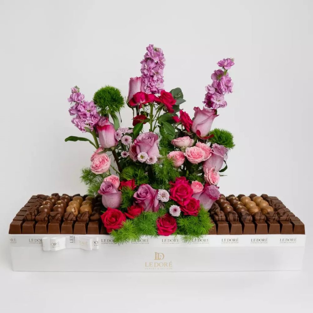 A luxurious box filled with 1.200kg of premium chocolate and decorated with flowers.