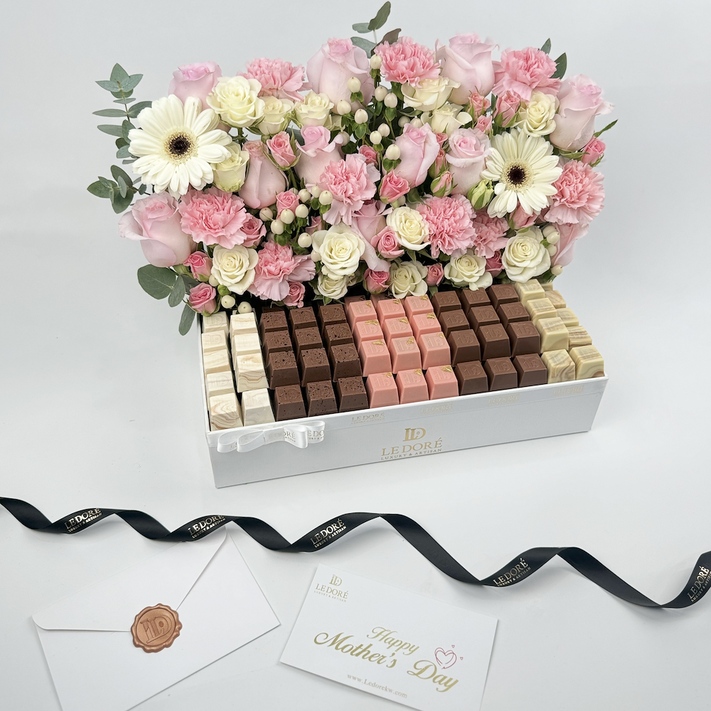 Special gift box contains 1 kilo grams of chocolate and arranged with fresh flowers.