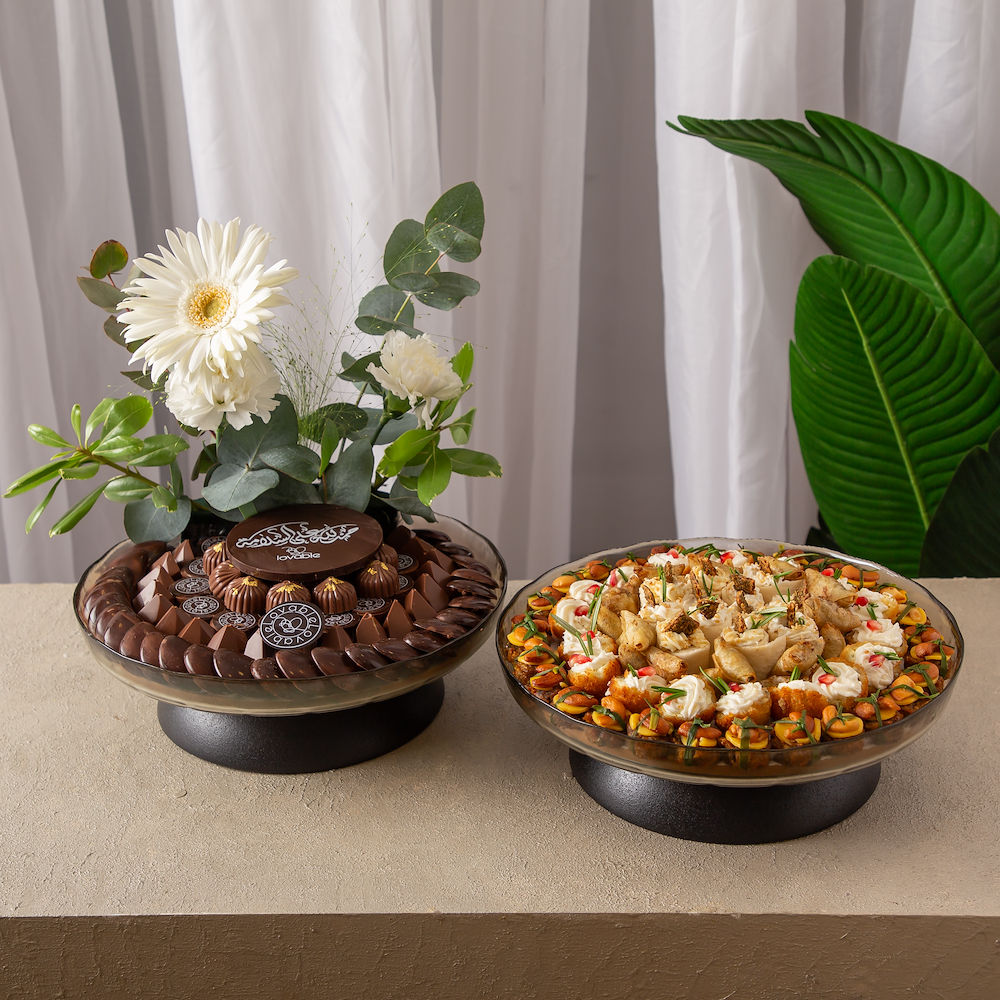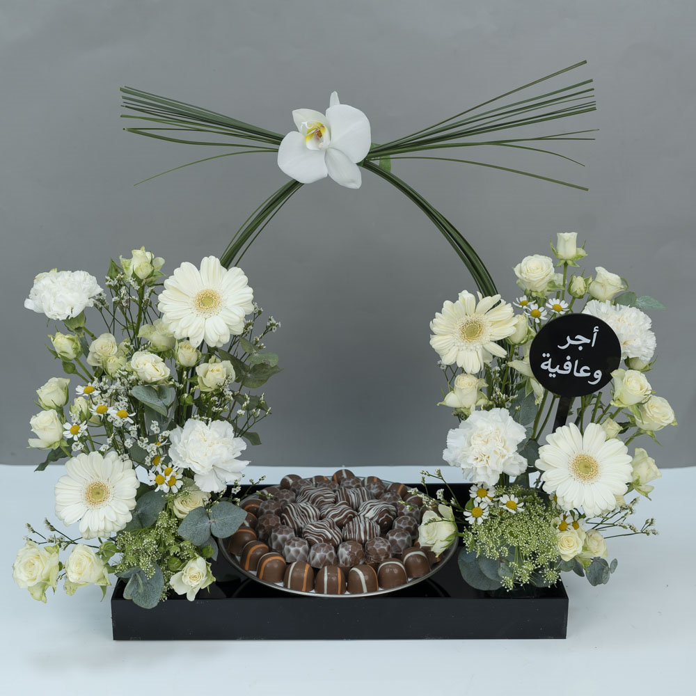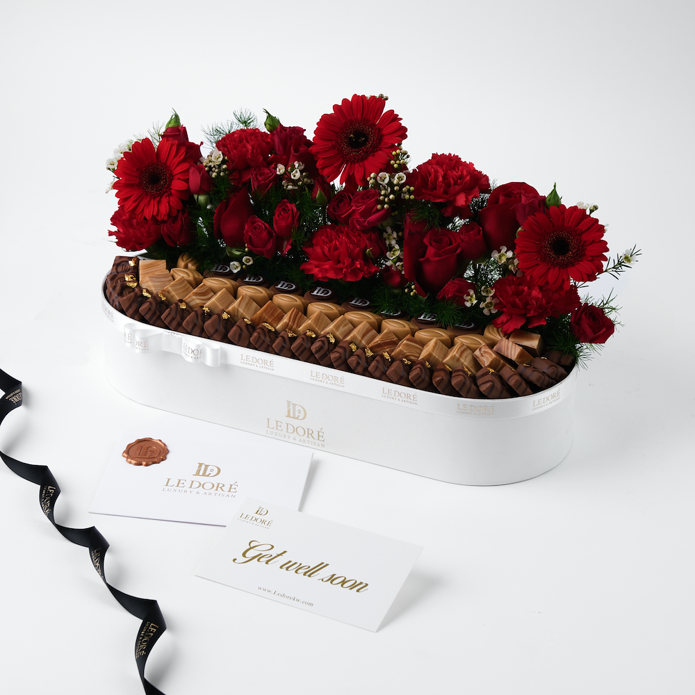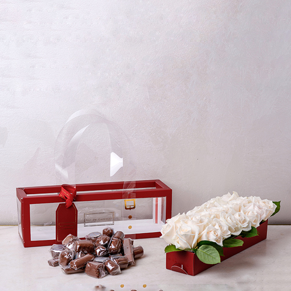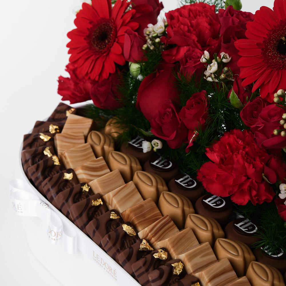A luxurious white box filled with 750g of premium chocolate with flowers.