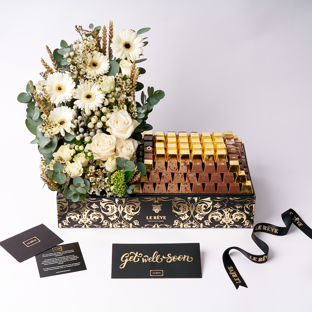A luxury crystal tray filled with 1.1 kg of mixed flavors premium chocolate.