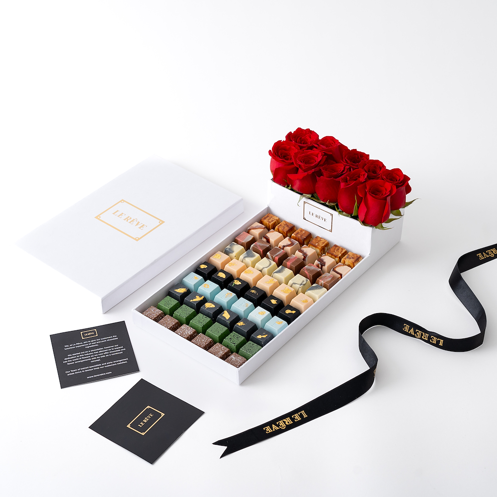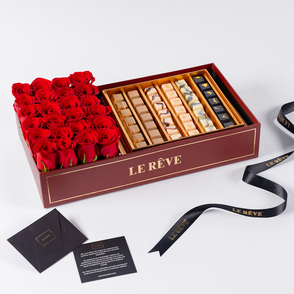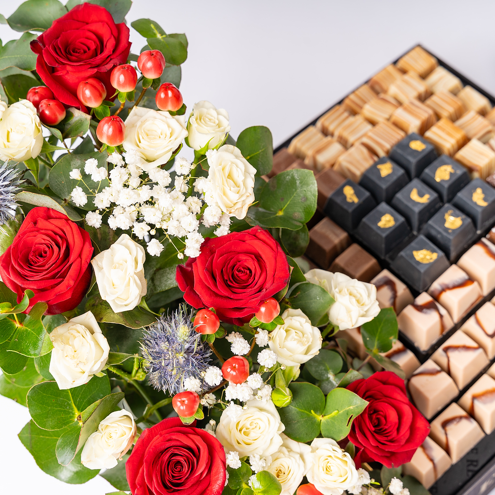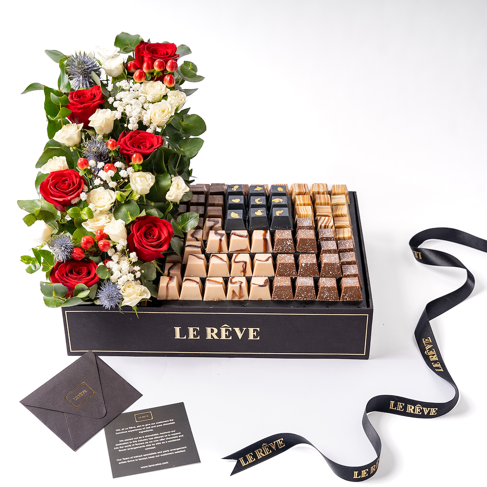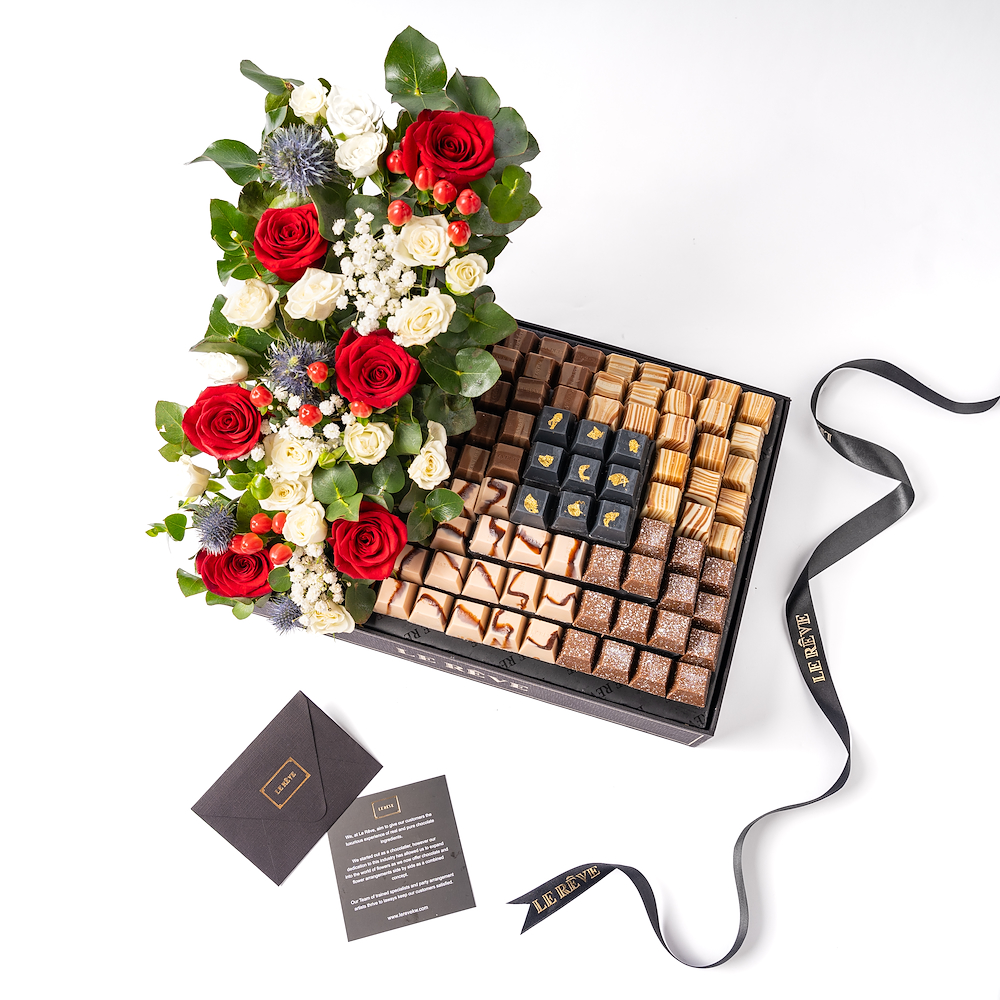 The box contains 1 kg of premium chocolates with a beautiful flower arrangement.
