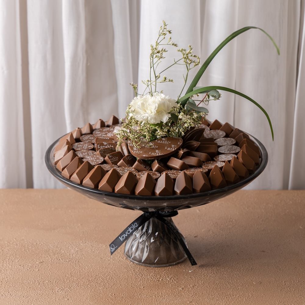 A black crystal dish with fresh roses and one kilogram of Swiss chocolate.