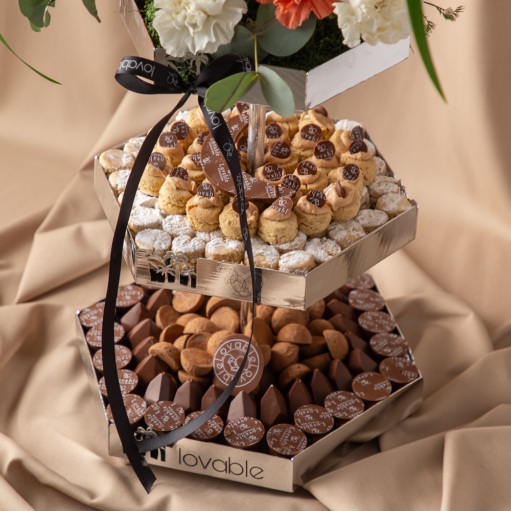A three-tier stand containing 1 kg of Swiss chocolates, 2 kg of Kuwaiti Ghuraiba, and natural flowers with a message.
