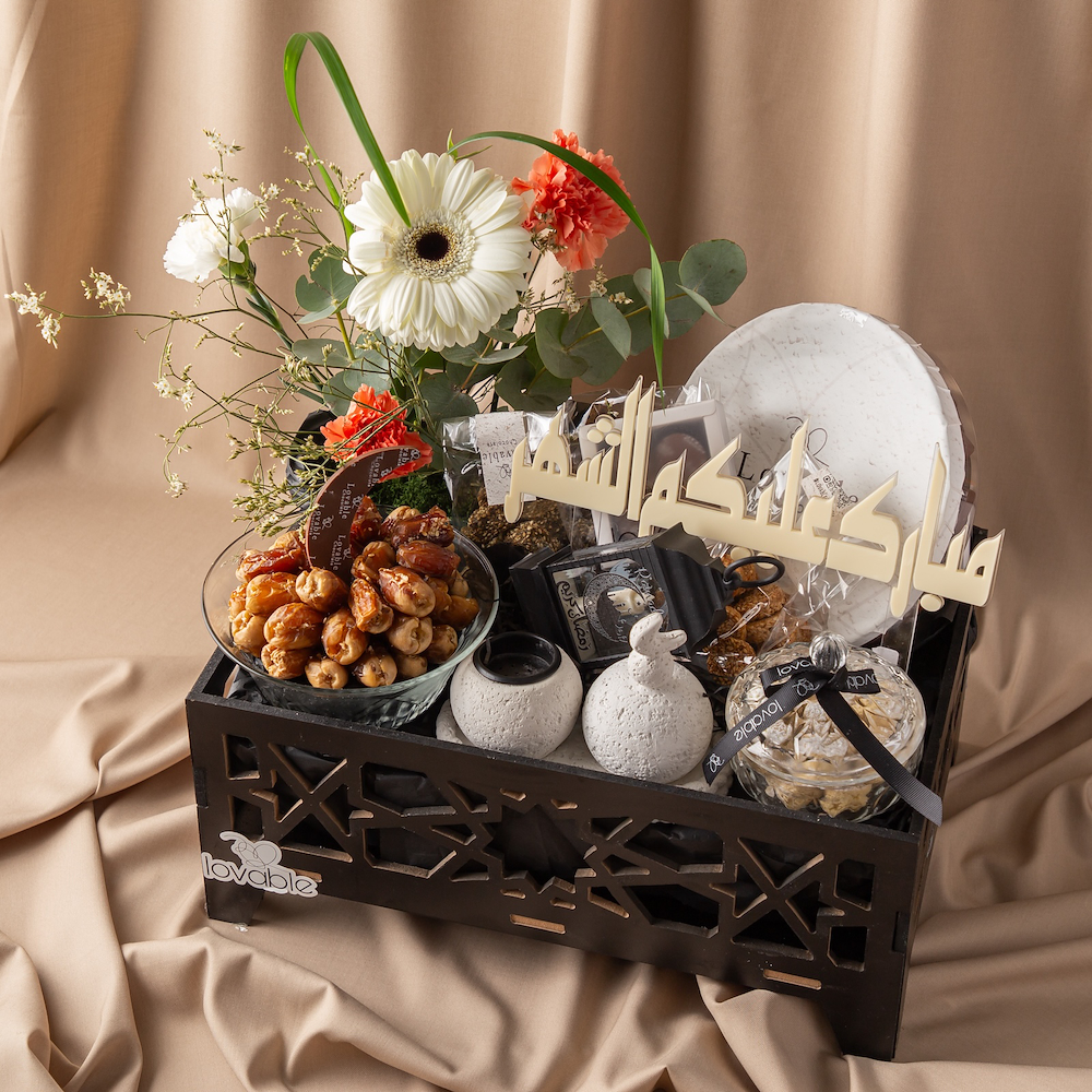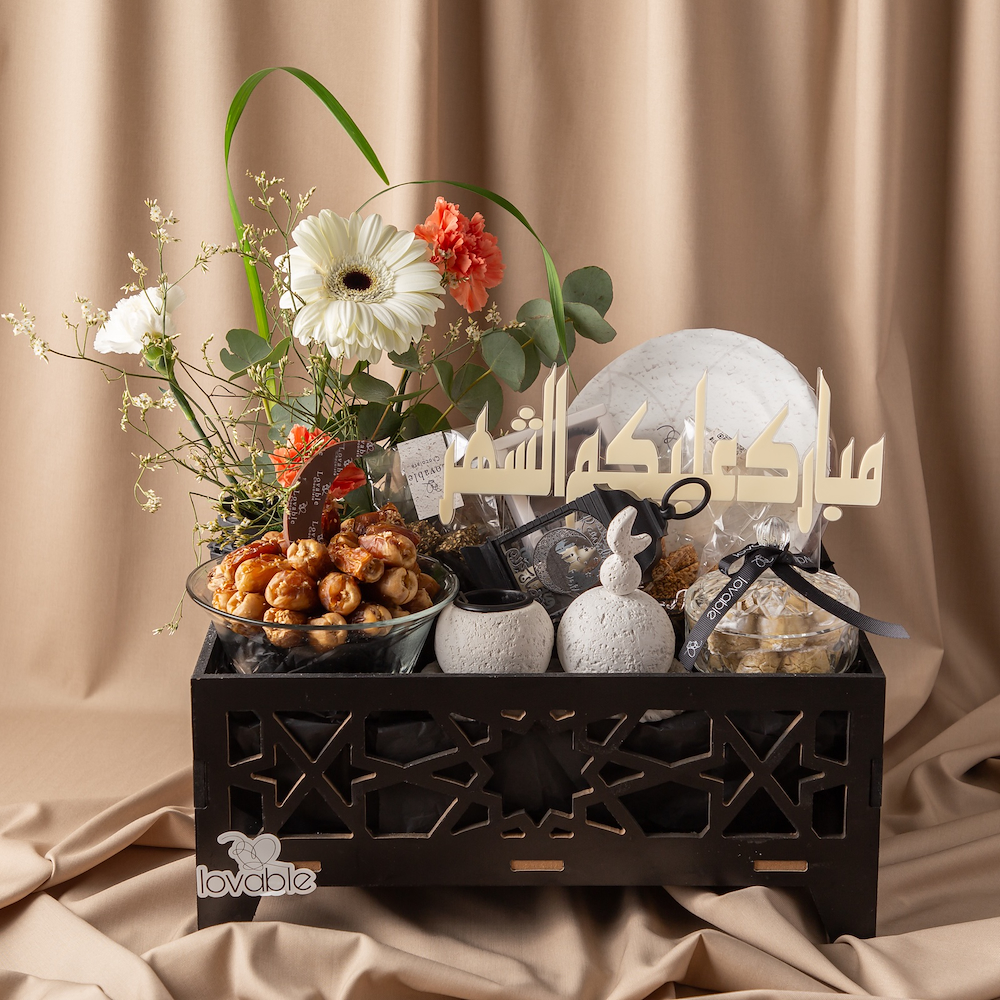 A basket containing dates with chocolate, Kuwaiti Ghuraiba, and 5 pieces of Simsimiya with flowers, an incense burner, an Allaq rosary, and a Ramadan crescent.