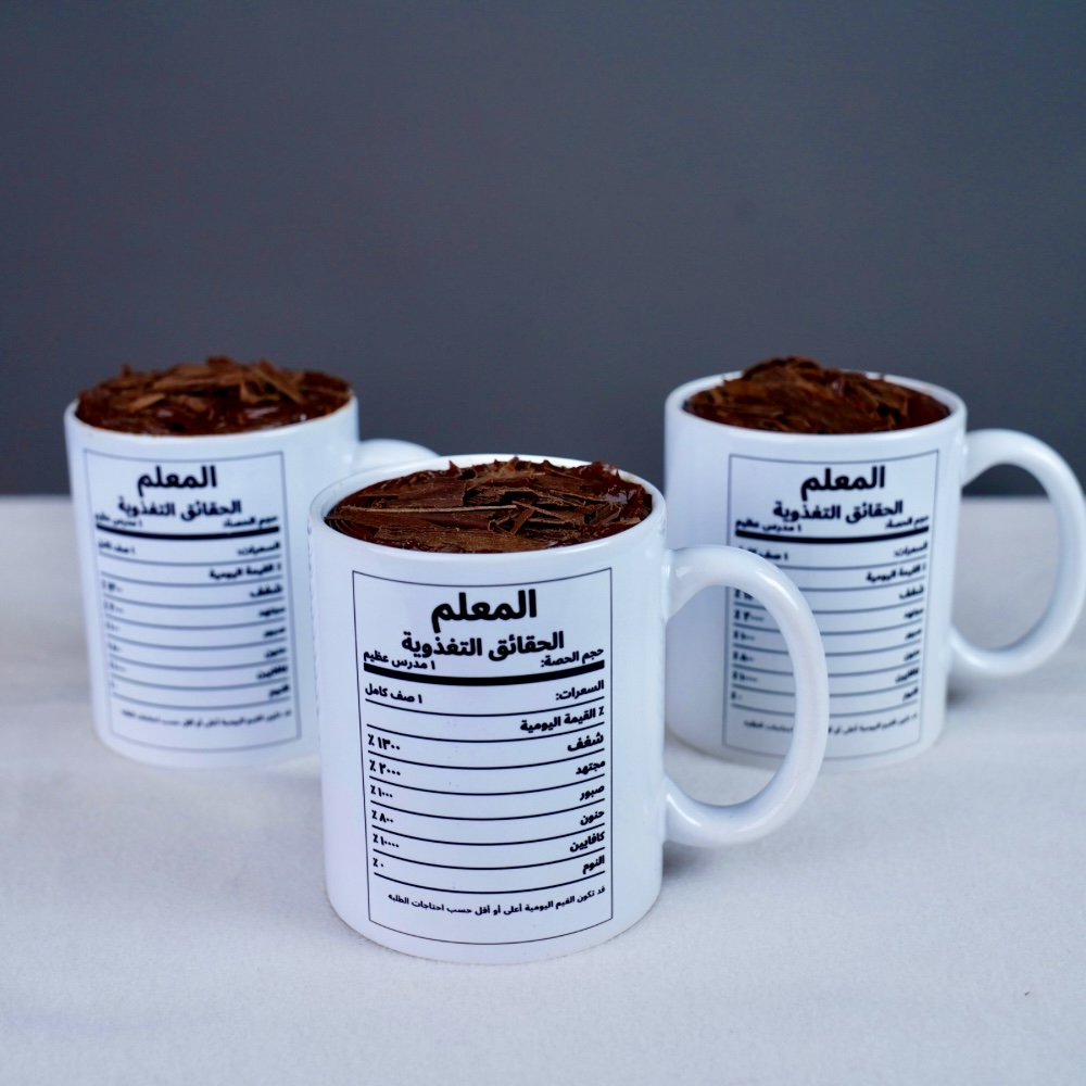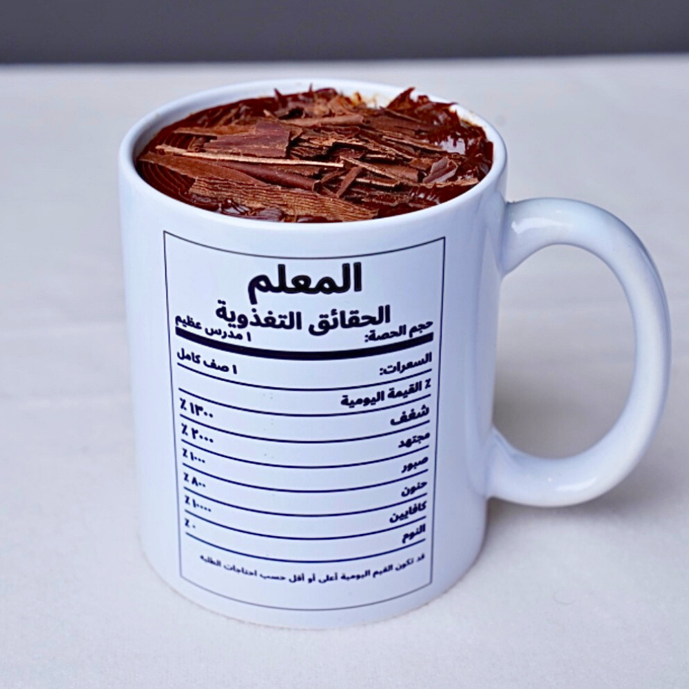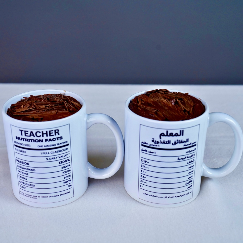 A mug with printed Arabic teacher facts, filled with chocolate cake and Belgian chocolate ganache.