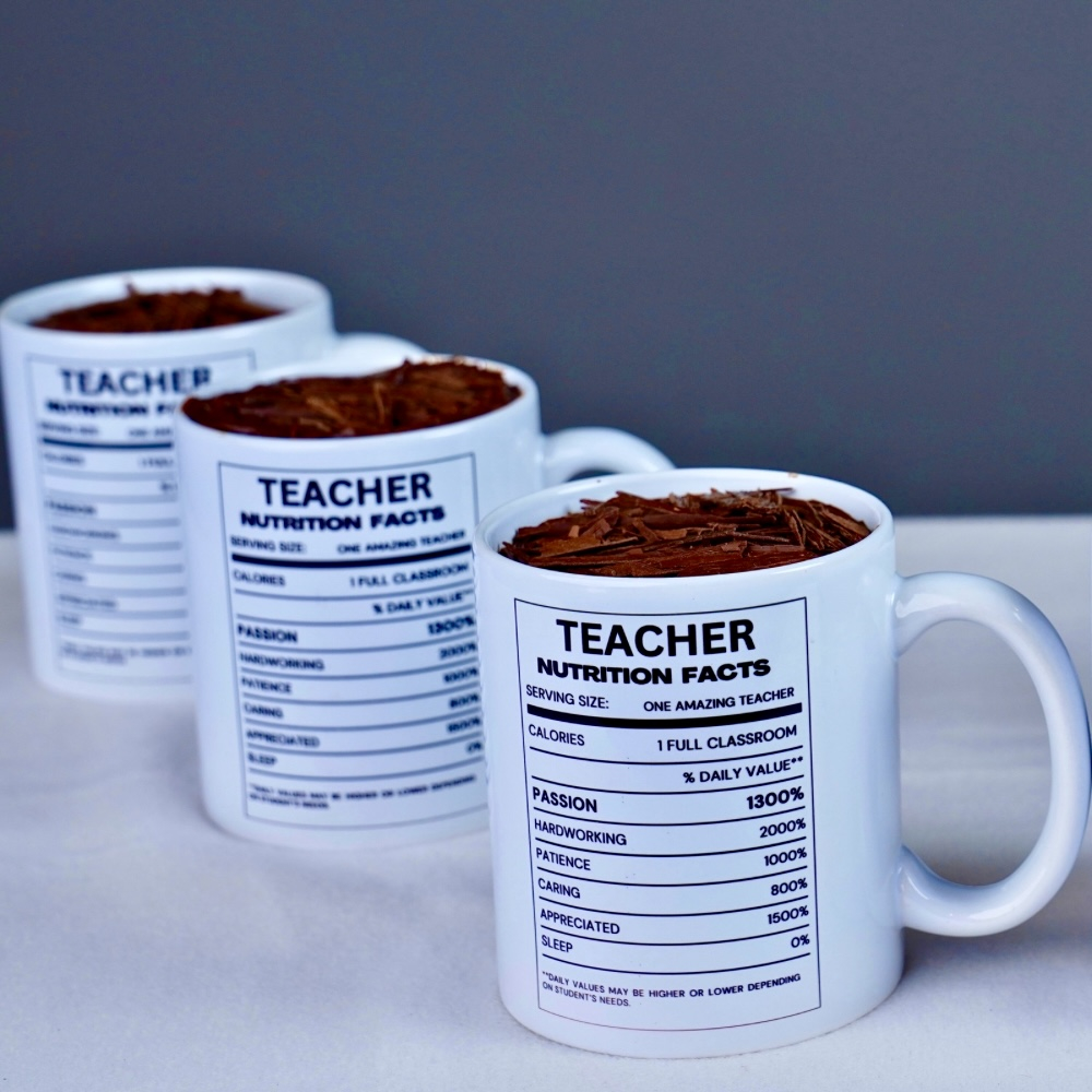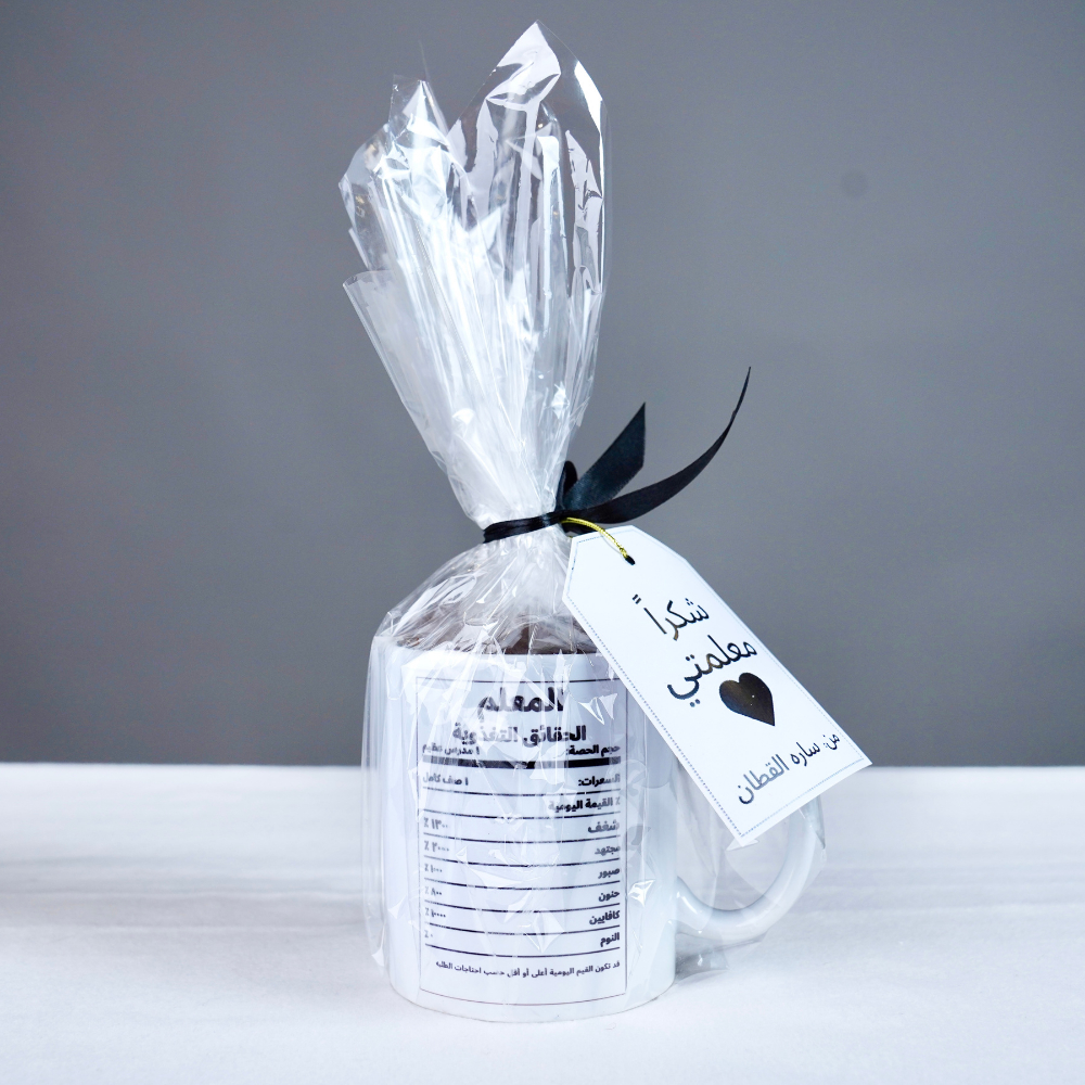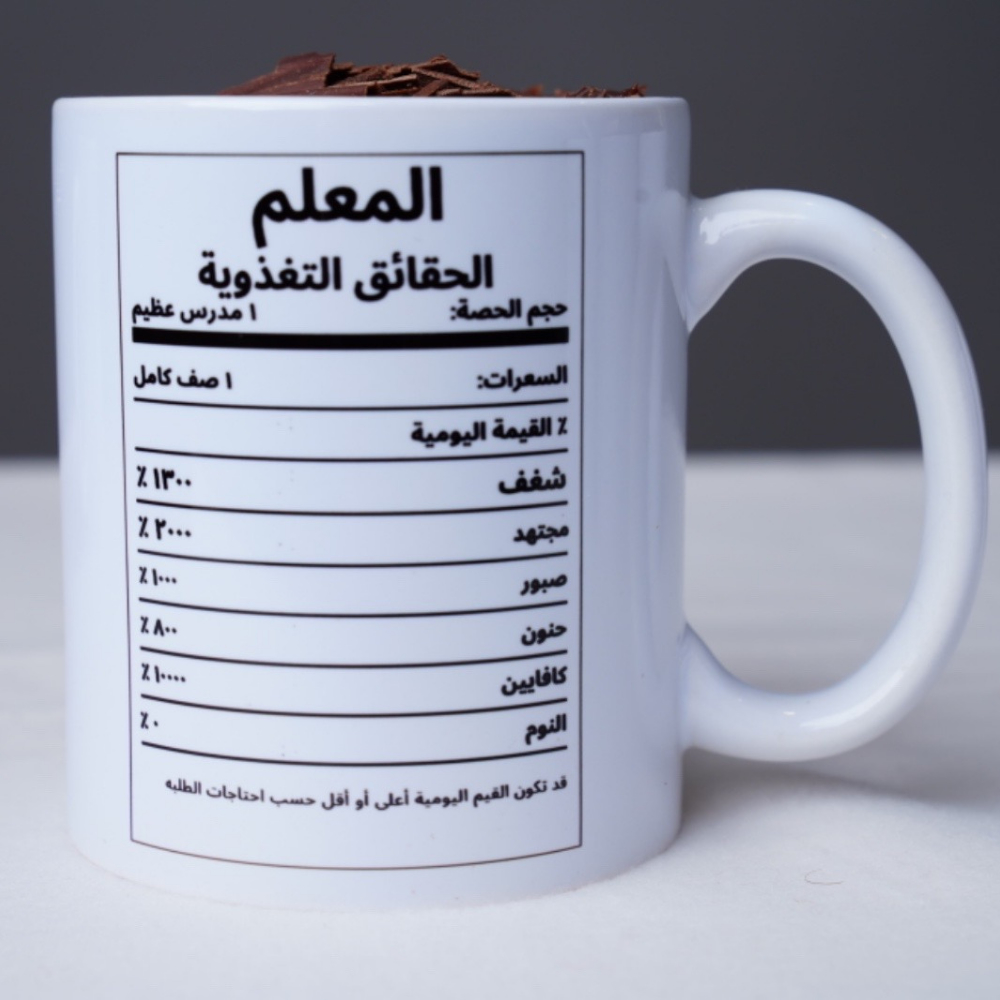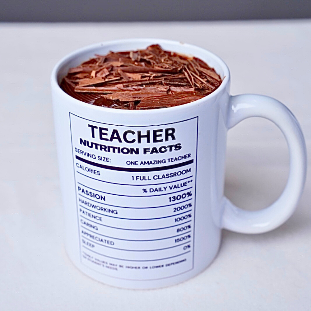 A mug with printed Arabic teacher facts, filled with chocolate cake and Belgian chocolate ganache.