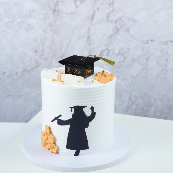 A four layered mix sponge cake (vanilla, chocolate and red velvet). Covered with cream cheese frosting and decorate with edible details and topped with congratulations topper.