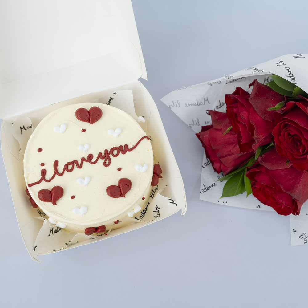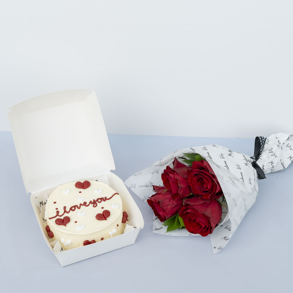 A delicious 4-inch chocolate bento cake, enough for 2 people. Comes with a hand bouquet of roses.
