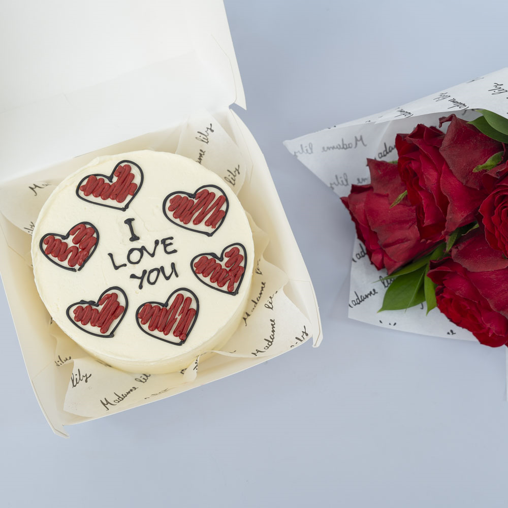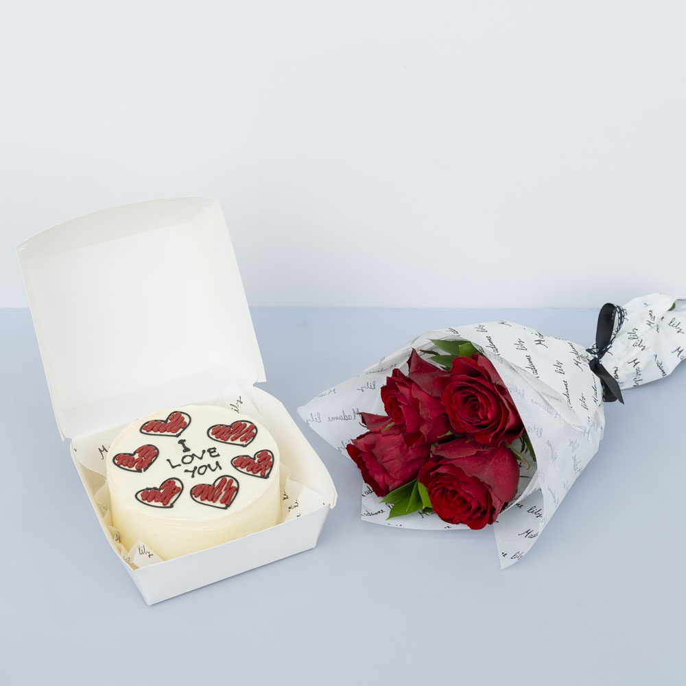 A delicious 4-inch chocolate bento cake, enough for 2 people. Comes with a hand bouquet of roses.