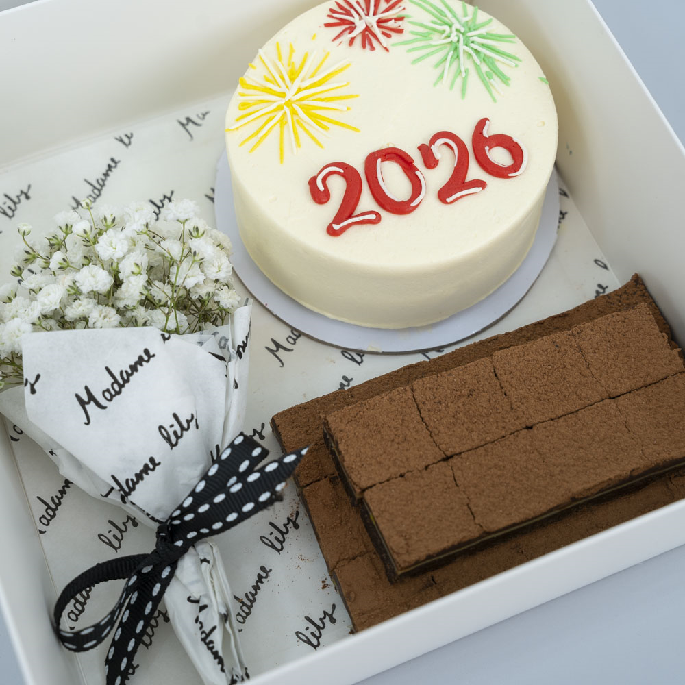 A box of luxury chocolates with a beautiful design with a mini chocolate cake and a mini hand bouquet.