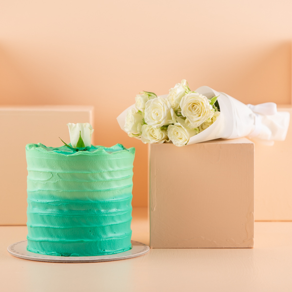 A soft cream cake decorated with roses and dried leaves with a mixed flowers hand bouquet.