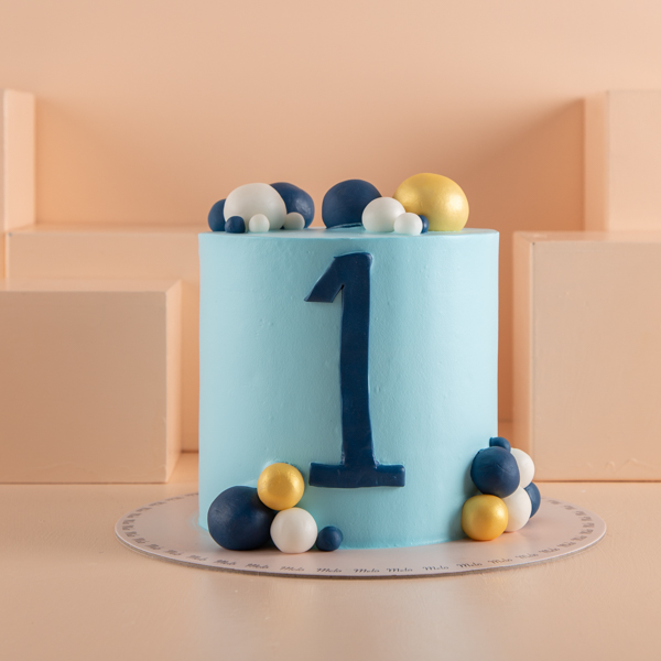A melo vanilla cake topped with balls and age. you can choose chocolate or red velvet flavor please write a note in the extra details.