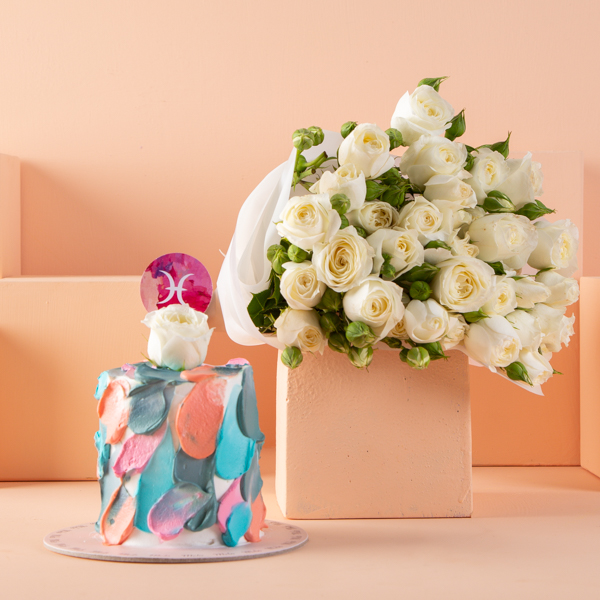 Melo vanilla cake topped with rose and the horoscope of yours or your loved ones and a roses hand bouquet (kindly mention your horoscope).