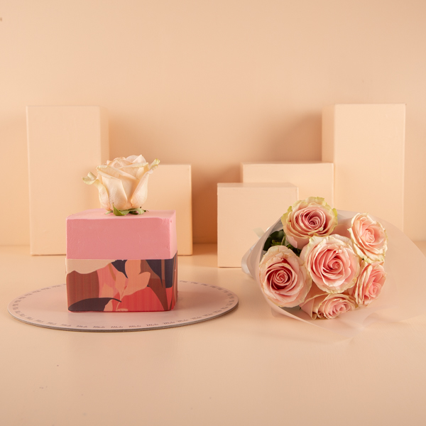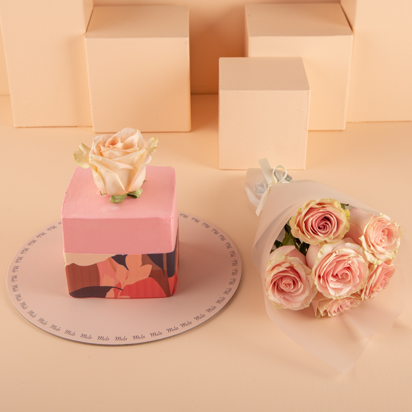 A butter frosting cake decorated with sugar sheet pattern and rose with a hand bouquet.