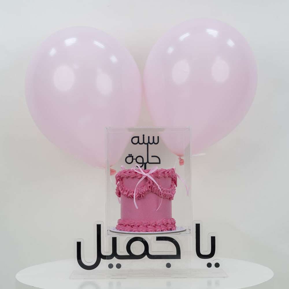 A 4-inch chocolate cake that comes in an acrylic tray with balloons.