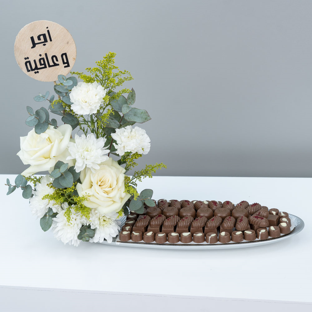 An elegant tray featuring premium assorted chocolates and decorated with delicate flowers.
