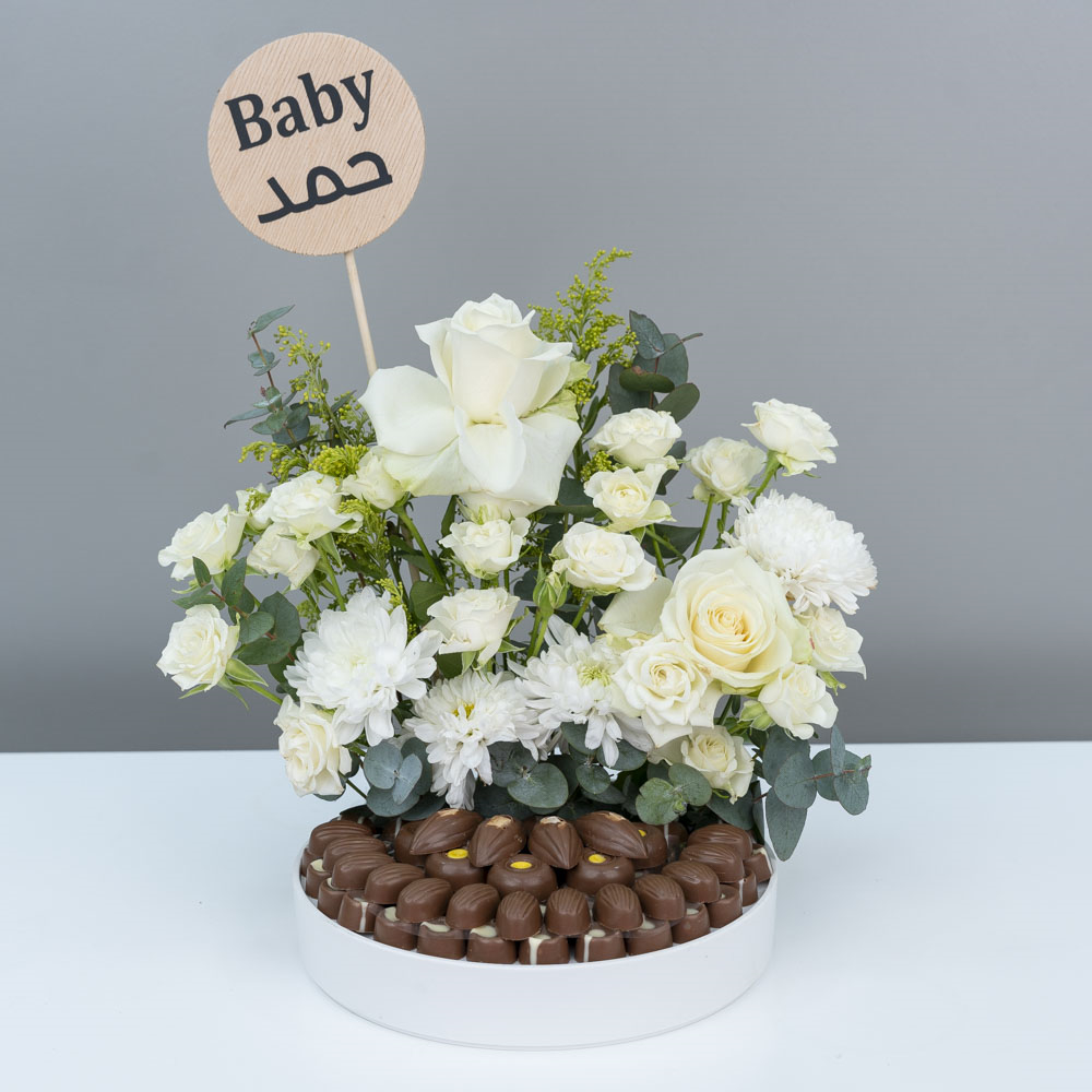 An elegant tray featuring premium assorted chocolates and decorated with delicate flowers.