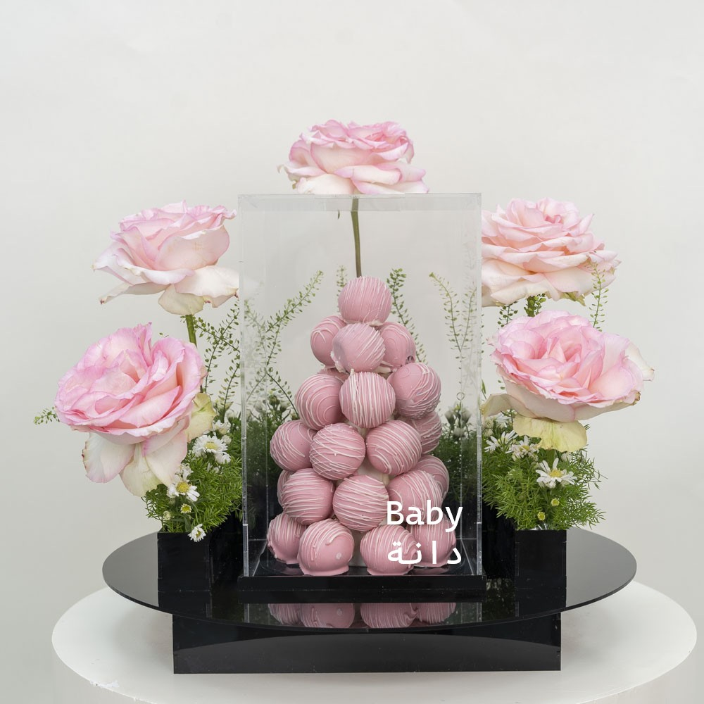 An acrylic tray containing roses and a tower of chocolate-flavored truffles.
