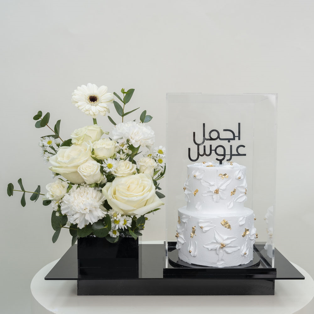 An acrylic tray containing roses, gerberas, carnations, and a tower of chocolate-flavored truffles.