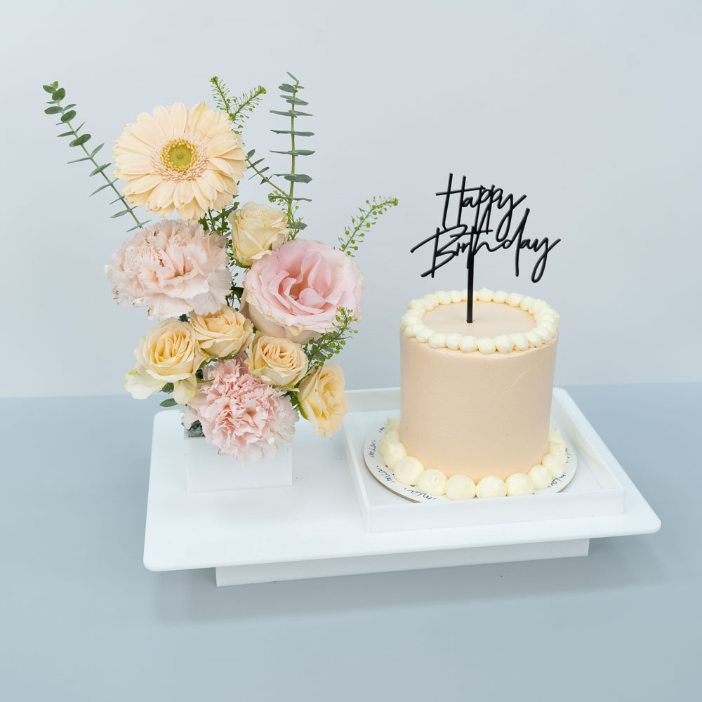 An acrylic tray styled with flowers and a 4-inch chocolate cake.
