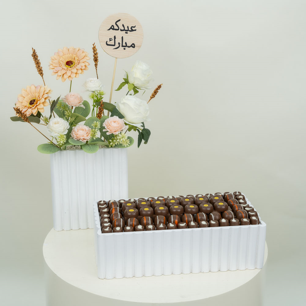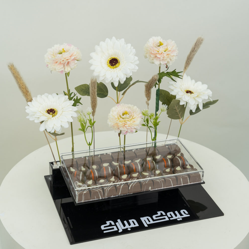 A beautifully designed acrylic tray containing artificial flowers and delicious luxury chocolates.