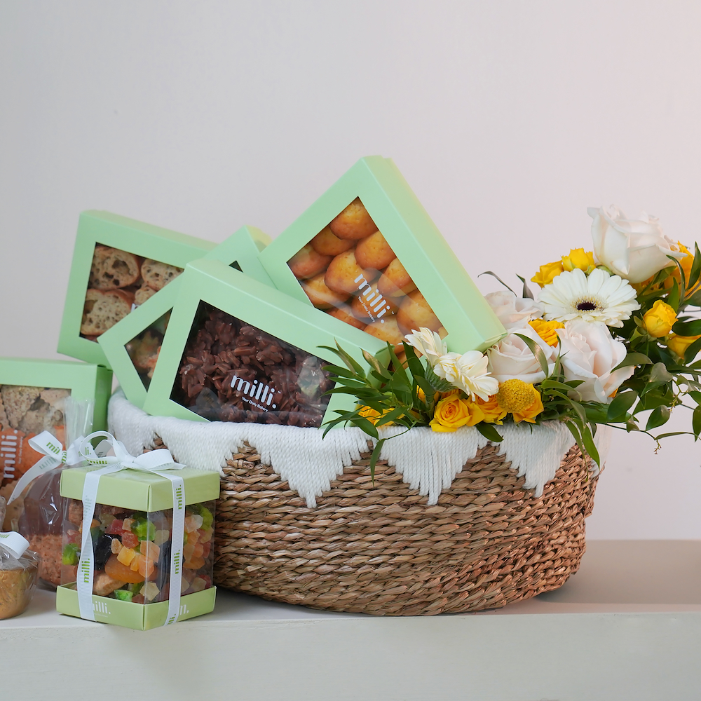 An elegant basket bouquet, featuring dried fruits, almond thins, madeleine cake, coconut macarons, mixed crackers, gluten free crackers, almond clusters, and star jam cookies, finished with a Ramadan accessory.