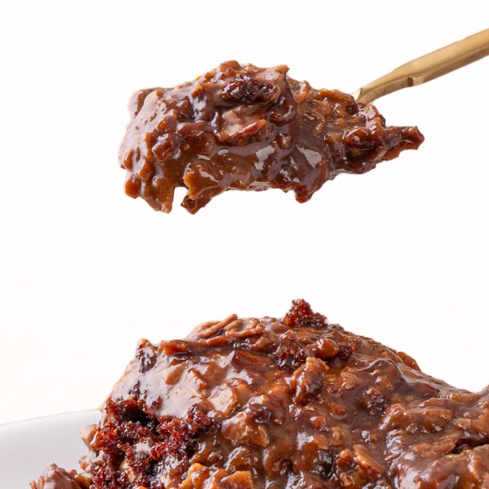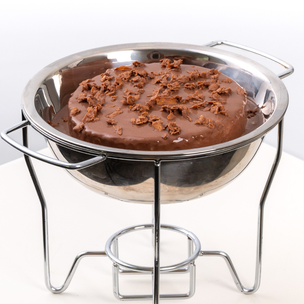 A decadent molten chocolate sponge featuring a flowing lava center with a signature hazelnut crunch and crispy biscuit bits, serving 6 to 8 people.