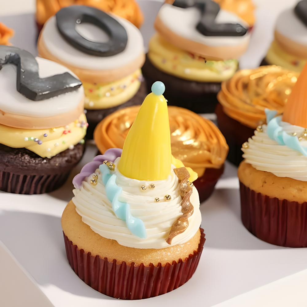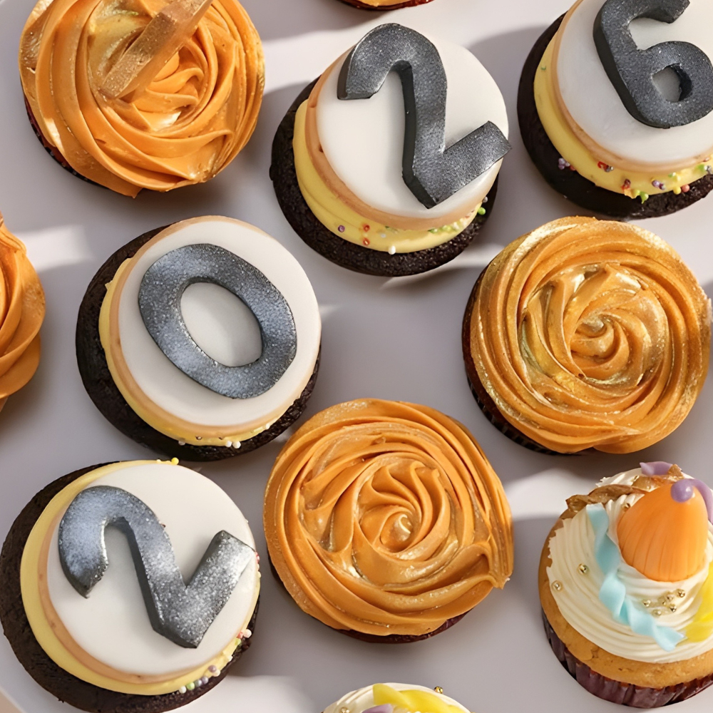 A festive box containing 12 cupcakes decorated with a new year theme, these delicious treats come in a blend of chocolate and vanilla flavors.