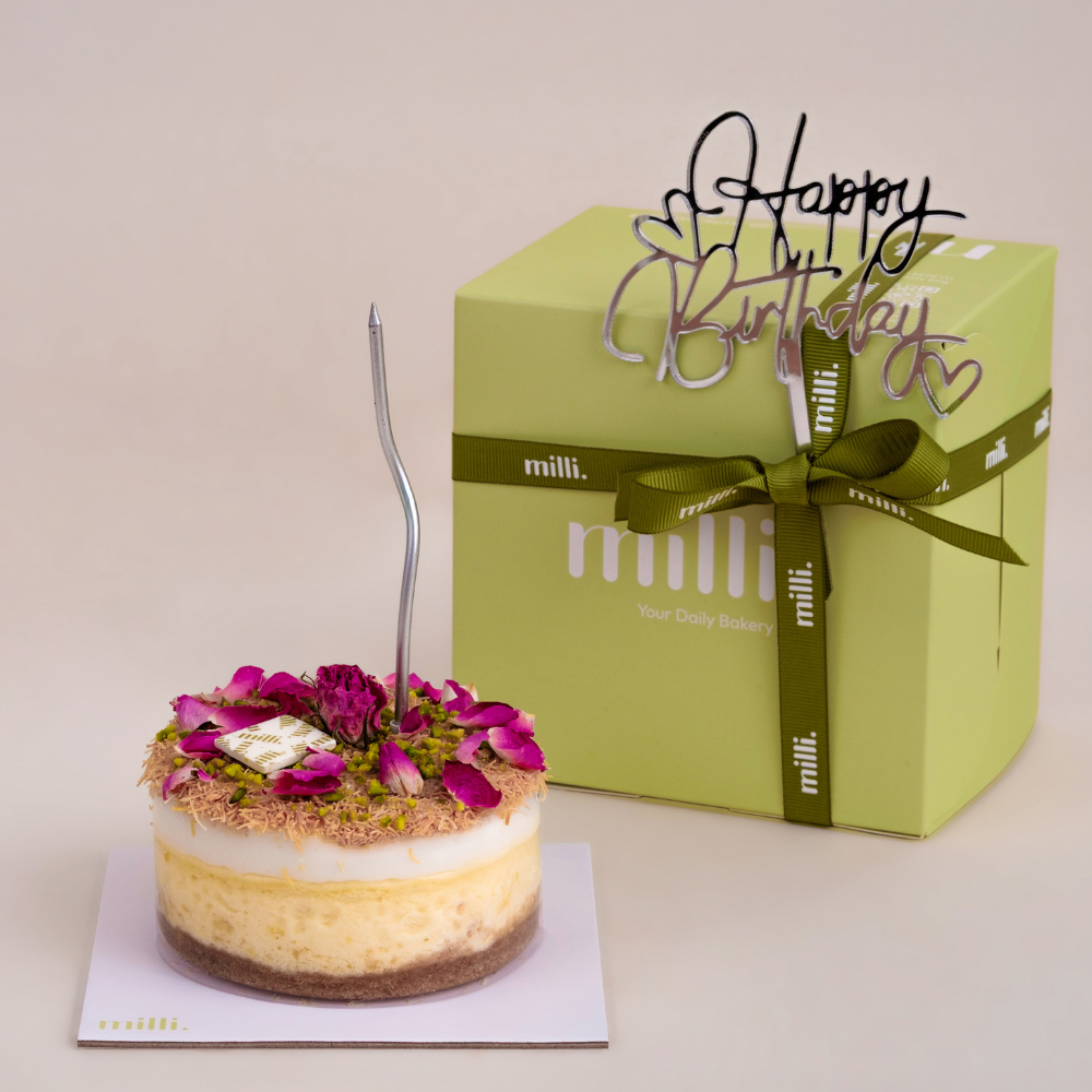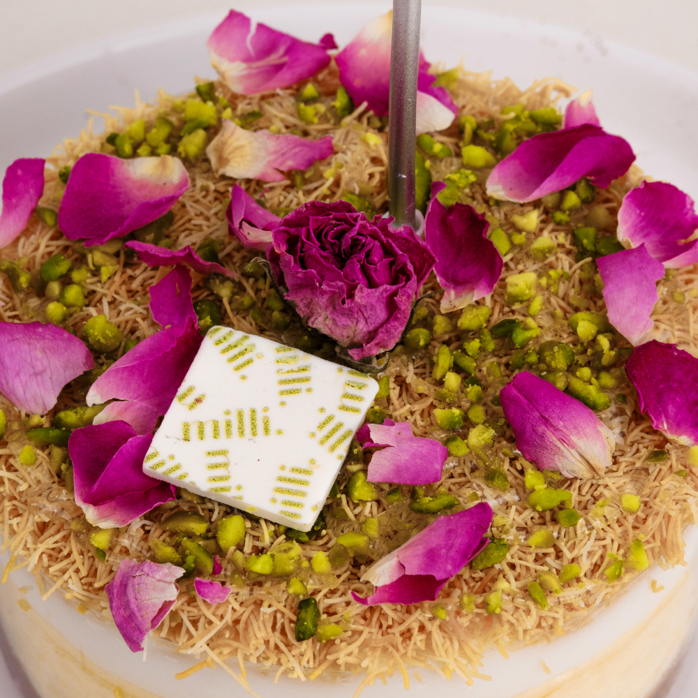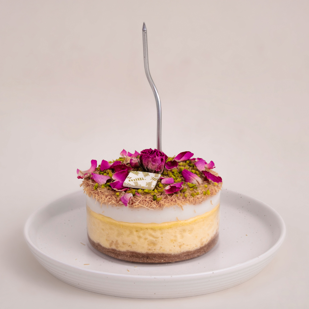 A 4-inch cheesecake layers with mahalabia topping and kunafa decorated with pistachio.