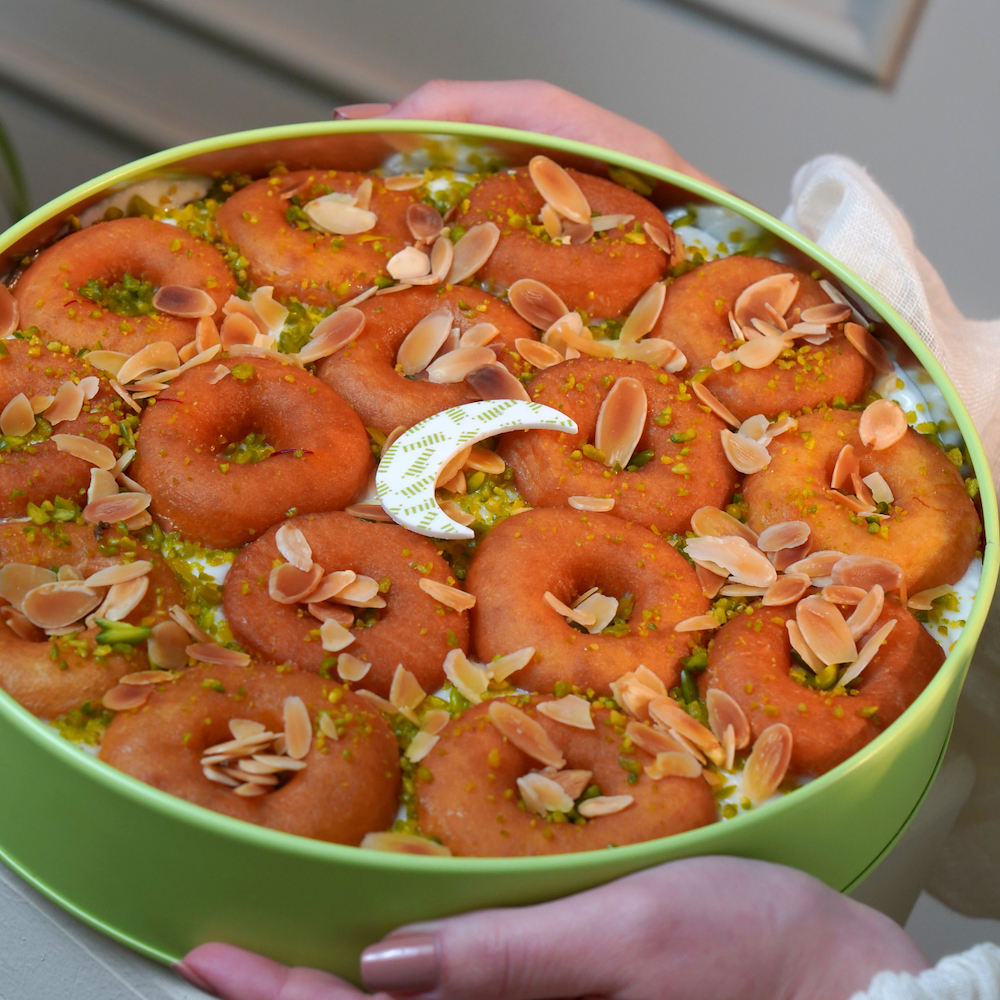 A modern donuts dessert inspired by kuwaiti mahalabia, served with sauce in a collectible tin, suitable for 10-12 people.