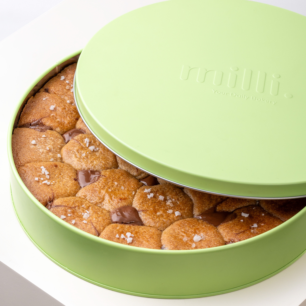 A milli signature tin featuring gooey molten cookies with rich chocolate sauce, perfect for sharing at gatherings, serving 8 to 14 people.