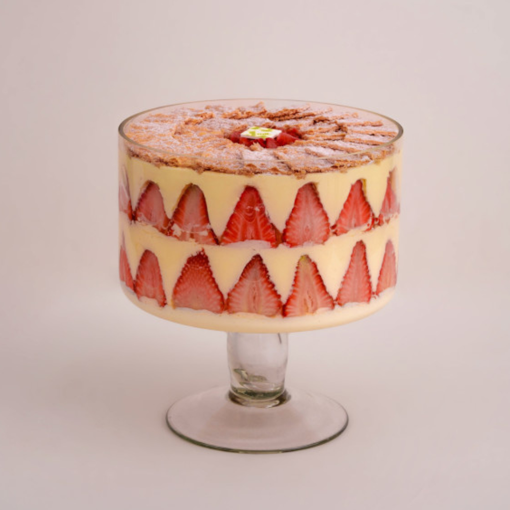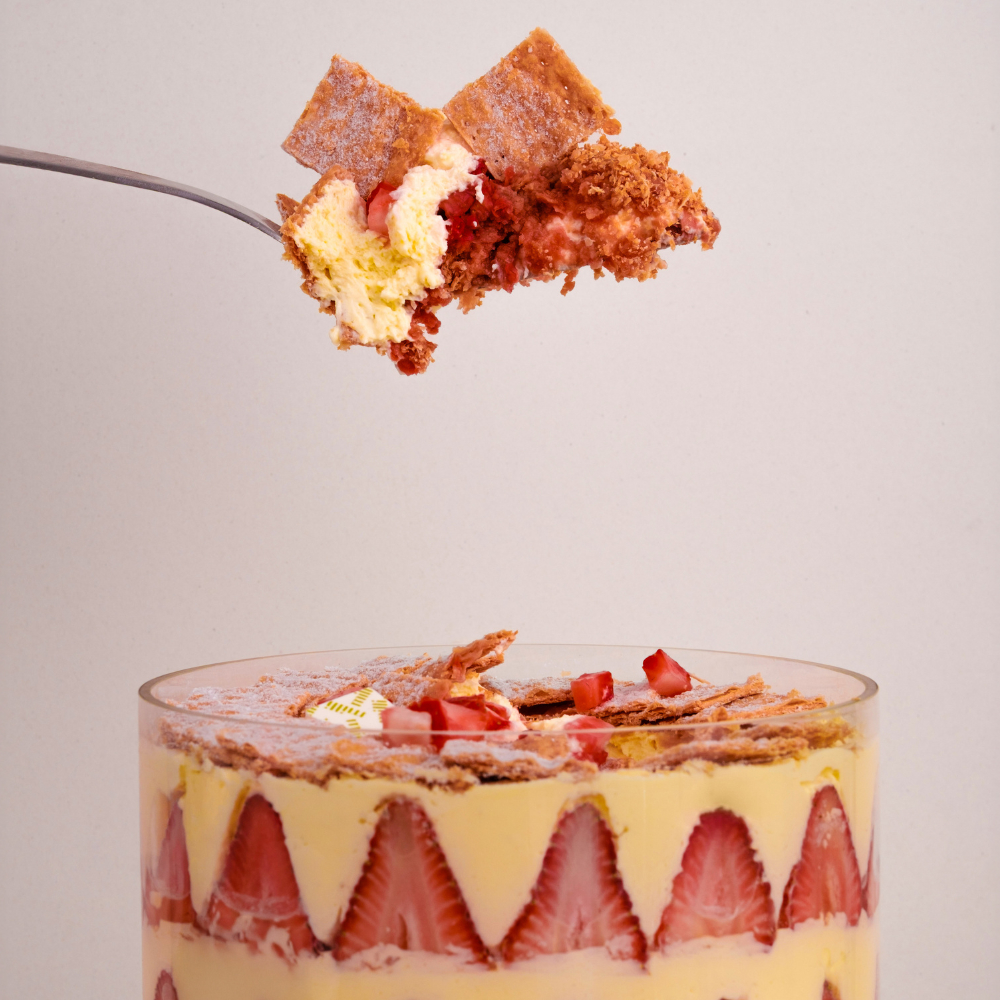 Layers of flaky millefeuille biscuits, cloud light pastry cream, and generous chunks of strawberries, stacked into a share worthy trifle bowl, airy yet indulgent, this beauty serves 8‑14 people.