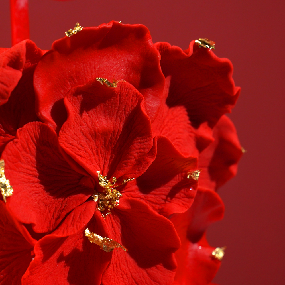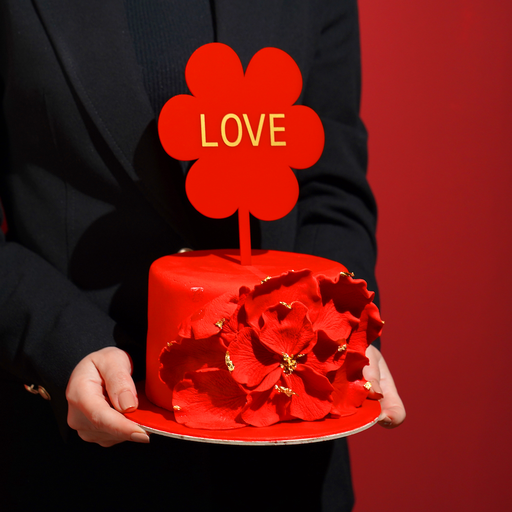 A 6-inch red velvet cake with a soft, velvety texture, finished in an elegant red design with floral details and a red love topper.