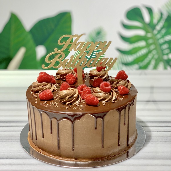 Our famous chocolate cake, with a base of crunch, decorated with raspberries and topped with happy birthday stick.