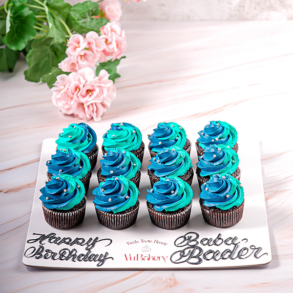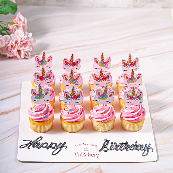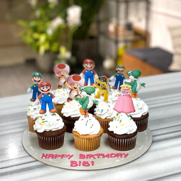 10 cupcakes in chocolate and vanilla flavors, decorated with super mario paper toppers.